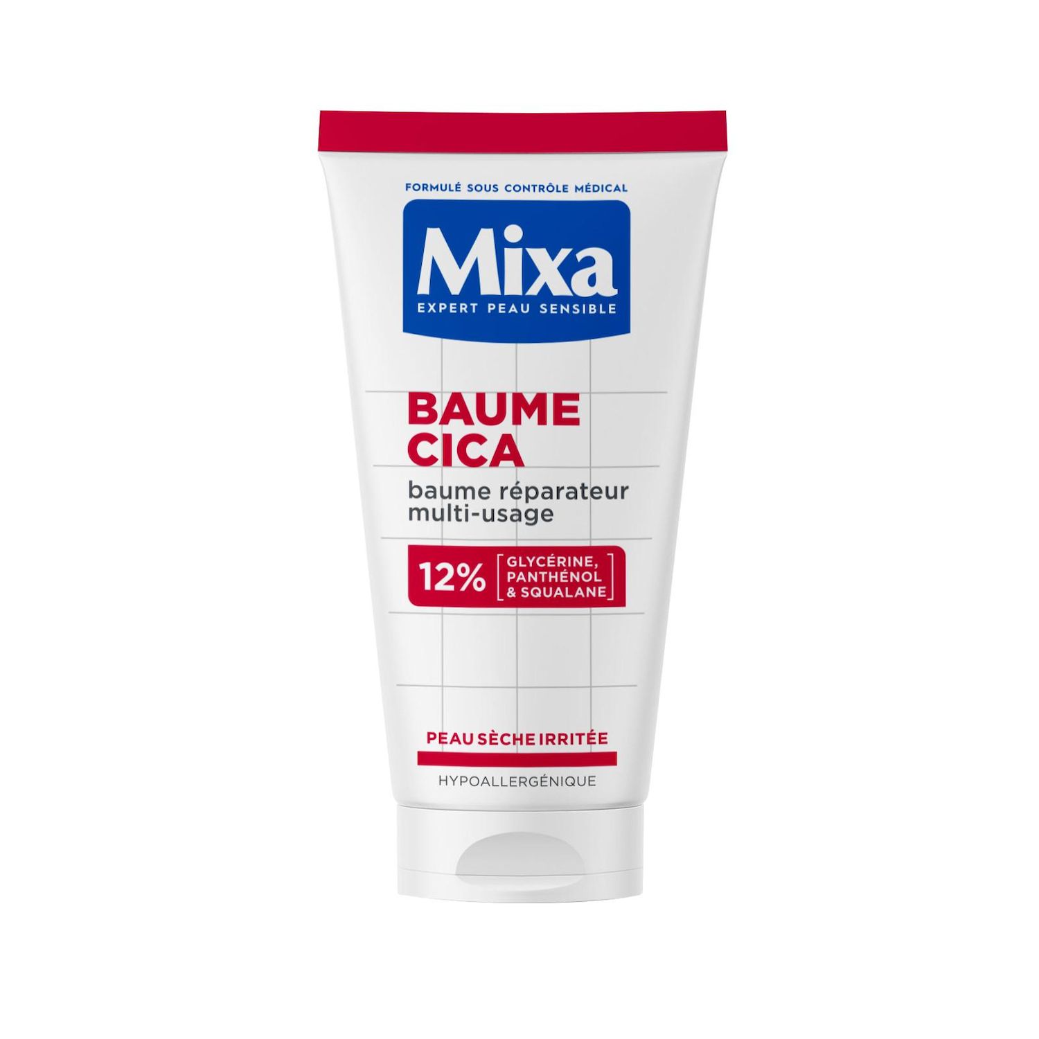 Découvrez le Baume Cica Mixa, un baume réparateur multi-usage pour peau sèche irritée. TEXTURE EFFET PANSEMENT ENRICHIE EN ACTIFS PUISSANTS ADAPTÉS AUX PEAUX SENSIBLES : le Panthénol connu pour ses propriétés apaisantes, La Glycérine connu pour protéger et hydrater intensément et le Squalane connu pour aider la peau à conserver l'hydratation. Formulé sous contrôle médical et adapté aux peaux sensibles, il assure une réparation accélérée pour toute la famille (bébé, enfant, adulte) et est testé sur 10 problèmes de peau comme les irritations superficielles, les lèvres sèches, le siège du bébé ou encore l'après-rasage. Apaise