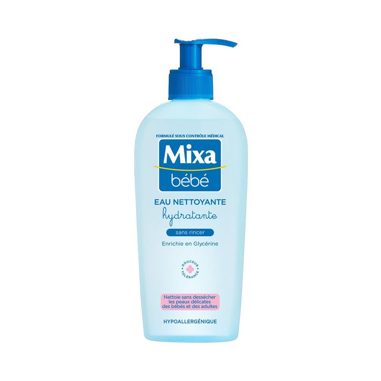 Spécialement conçue pour la toilette des épidermes les plus délicats, l'Eau Nettoyante Bébé Mixa nettoie efficacement et n'a pas besoin d'être rincée.