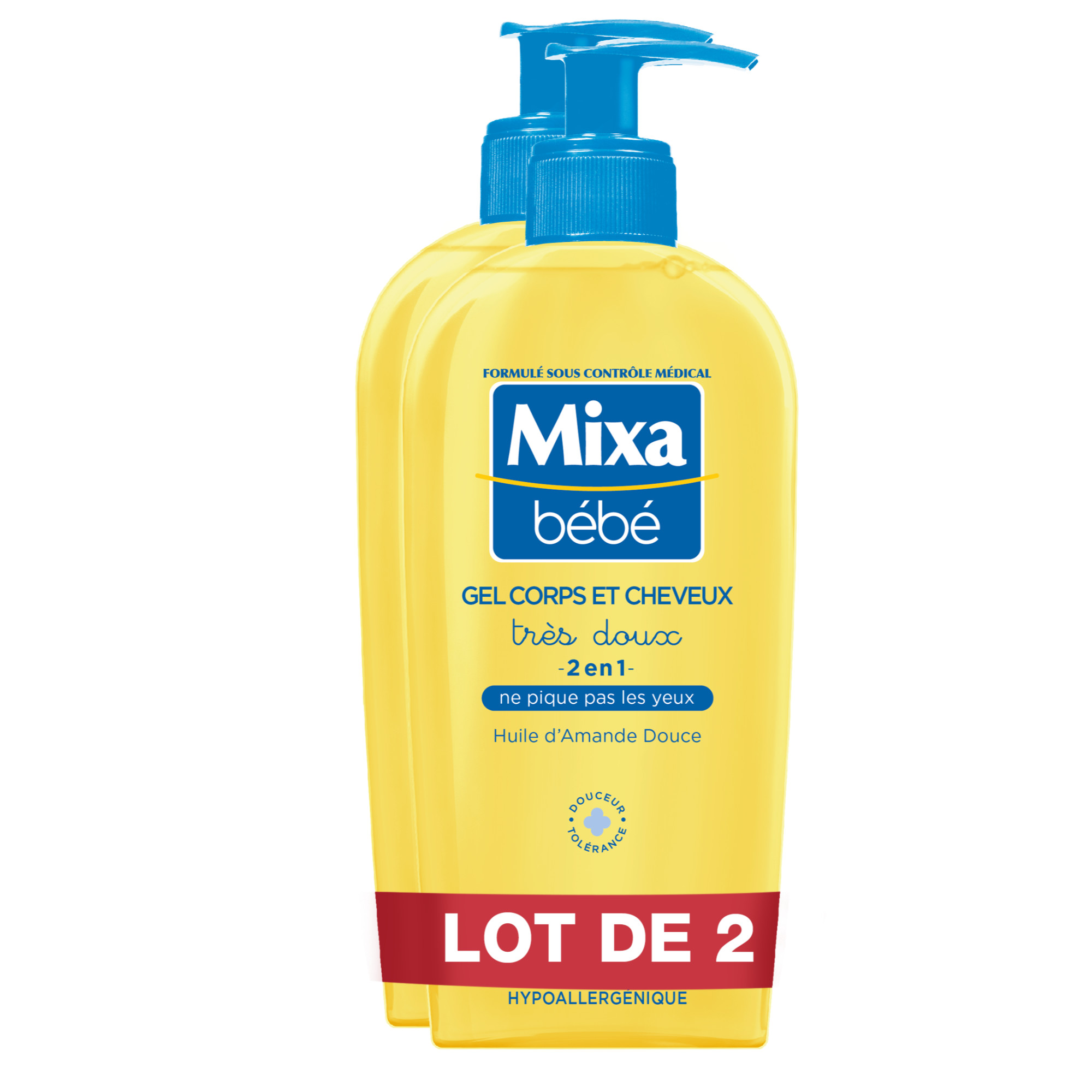 Mixa bebe gel lavant 2 en 1 corps et cheveux tres doux lot de 2x250ml Le Gel Corps et Cheveux Mixa Bébé, enrichi en huile d'amande douce, lave en douceur la peau sensible et les cheveux délicats des bébés et des adultes. Sans savon, sa formule préserve la barrière protectrice de la peau. La peau est délicatement douce et les cheveux sont soyeux. Formulé sous contrôle médical Hypoallergénique - Sans Paraben