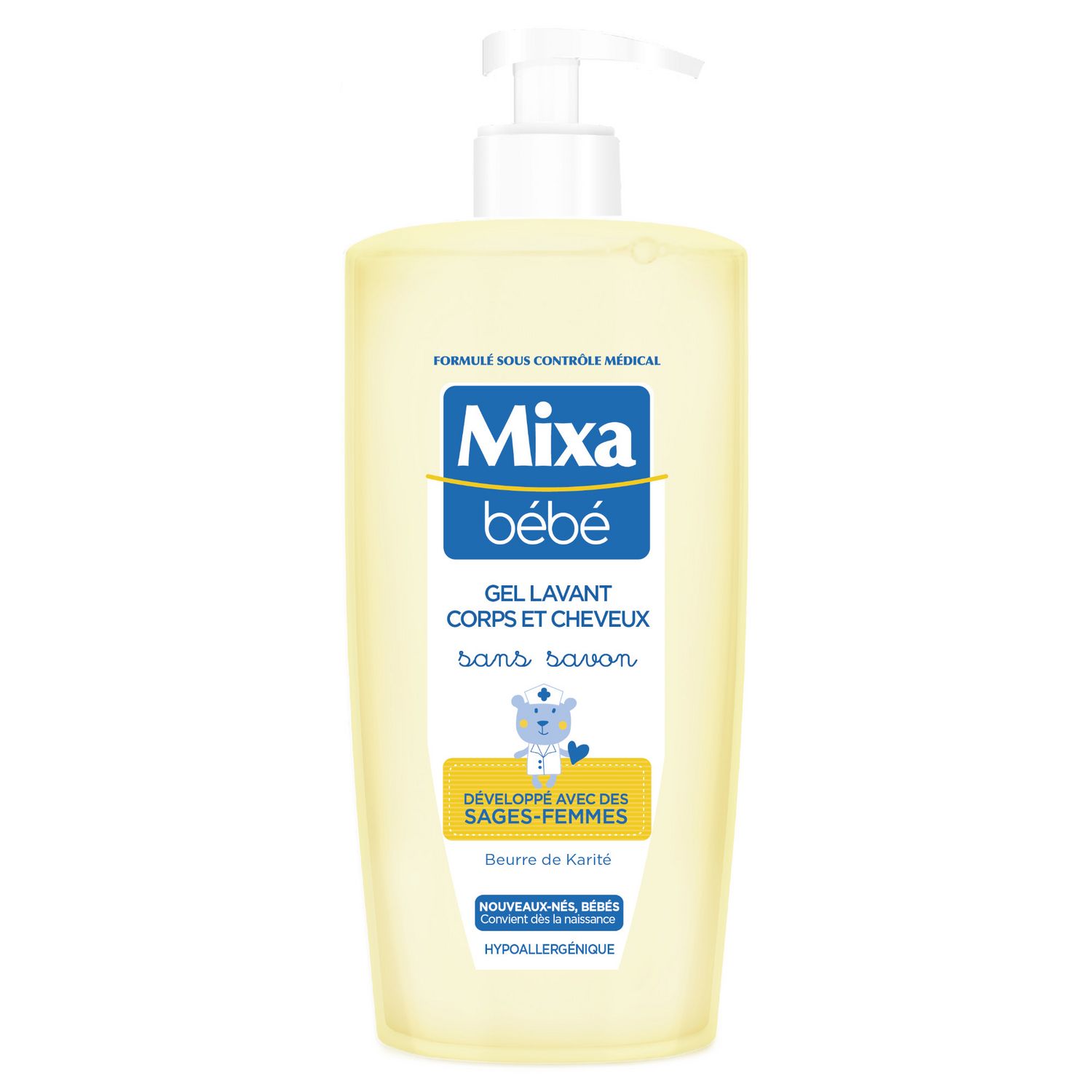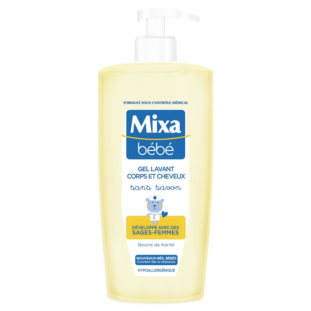 CONVIENT DÈS LA NAISSANCE - Formulé sous contrôle médical. - Sans savon pour laver tout en douceur la peau et les cheveux de bébé. - Au beurre de Karité pour nourrir et protéger durablement la peau. - Formule hypoallergénique pour minimiser les risques d'allergie. - Haute tolérance pour le plus grand respect des nouveaux-nés et de bébé. - pH neutre pour la peau. - Ne pique pas les yeux. Parfaitement propre, la peau de bébé est aussi protégée du dessèchement, douce et confortable. Les cheveux sont doux et brillants.