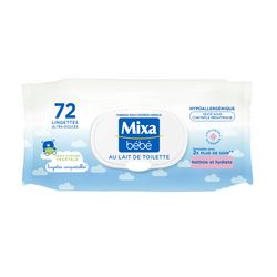 Les lingettes Mixa Bébé au lait de Toilette ont été spécialement formulées pour respecter la peau délicate des nourrissons : • Elles nettoient efficacement et sans rinçage les fesses du nourrisson. • Riches en huile d’Amande douce, en Vitamine E et enrichie en Glycérine pour 2X plus de soin*, elles hydratent aussi la peau, la protègent des irritations et lui apportent une infinie douceur. • Son parfum douceur est particulièrement adapté à la toilette des nourrissons et des adultes. Pratique, leur système d’ouverture facile permet une distribution une à une et le clapet protecteur évite leur dessèchement. La peau de bébé est propre, douce, hydratée et bien protégée.