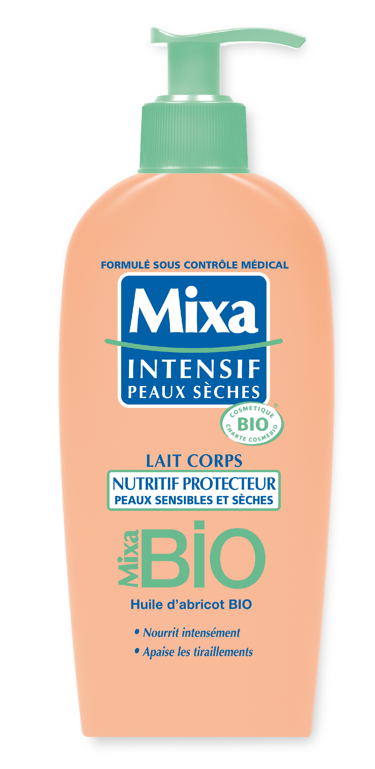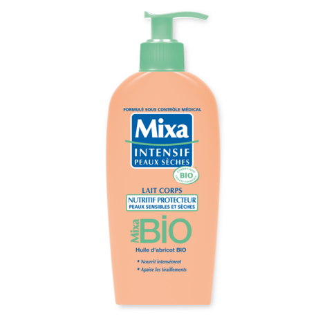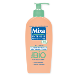 Le lait corps nutritif protecteur Bio de Mixa offre à votre peau les bienfaits des ingrédients d'origine naturelle et ce dans le plus grand respect de votre peau sensible et sèche. Immédiatement, votre peau est apaisée, elle retrouve son confort et son velouté. Durablement nourrie et protégée, les sensations d’inconfort (tiraillements, démangeaisons) sont atténuées, elle est moins sensible aux agressions extérieures.
