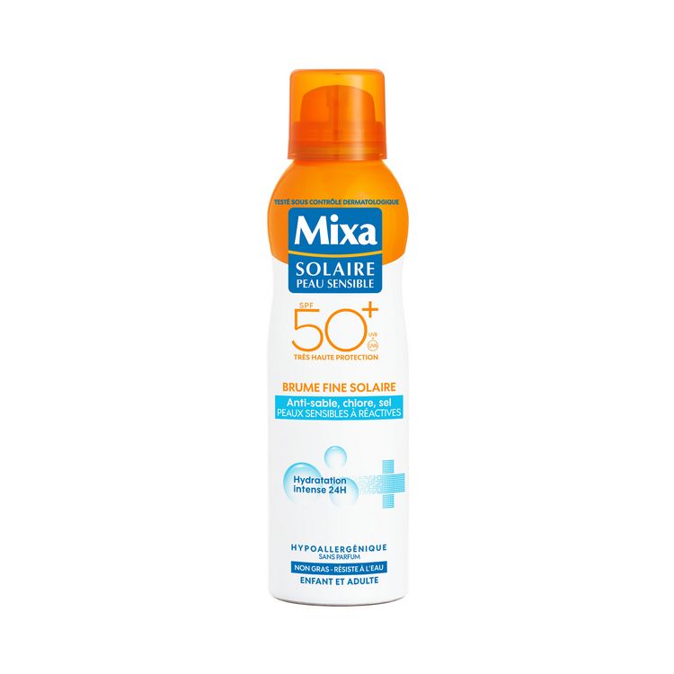 La Brume Fine Solaire SPF50+ de Mixa est spécialement formulée pour une protection efficace des peaux sensibles à réactives. Avec son diffuseur innovant, elle offre une couvrance homogène et une protection optimale des peaux sensibles, dont celle des enfants.