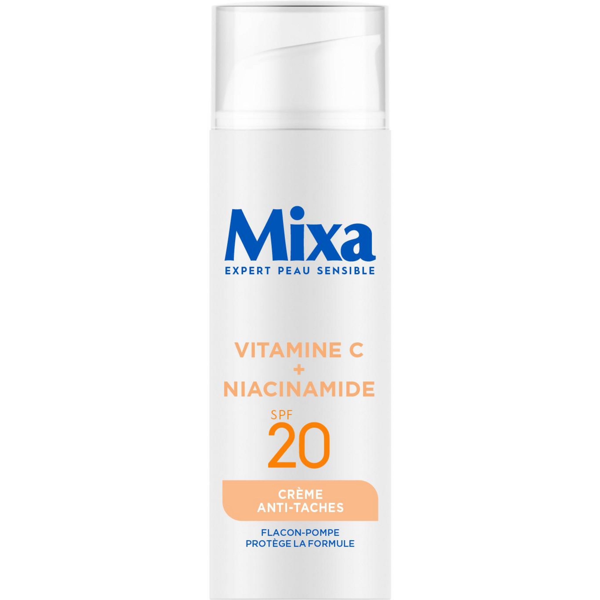 La nouvelle crème Anti-taches Mixa pour les teints ternes et irréguliers. Efficacité prouvée : cette crème limite l’intensité des taches et unifie le teint. La peau est hydratée pendant 48h*. Hypoallergénique. Formulé sous contrôle médical. LE MIX PARFAIT DE 2 ACTIFS COMPLEMENTAIRES : La vitamine Cg : Dérivé de la vitamine C, connu pour améliorer l’éclat de la peau. La Niacinamide : connu pour atténuer les taches et uniformiser le teint. CRÈME LÉGÈRE Texture légère et rafraichissant, ne laisse pas de traces blanches. Formule sans alcool.** FLACON-POMPE ANTIOXYDANT : Protège du contact avec l’air pour une meilleure conservation de la formule Découvrez la routine complète Mixa ! cette crème est compatible avec les sérums et nettoyants de la gamme Mixa. *Test instrumental sur 24 sujets. **Alcool ethylique En 4 semaines, les taches sont diminuées** **Test clinique sur 40 sujets