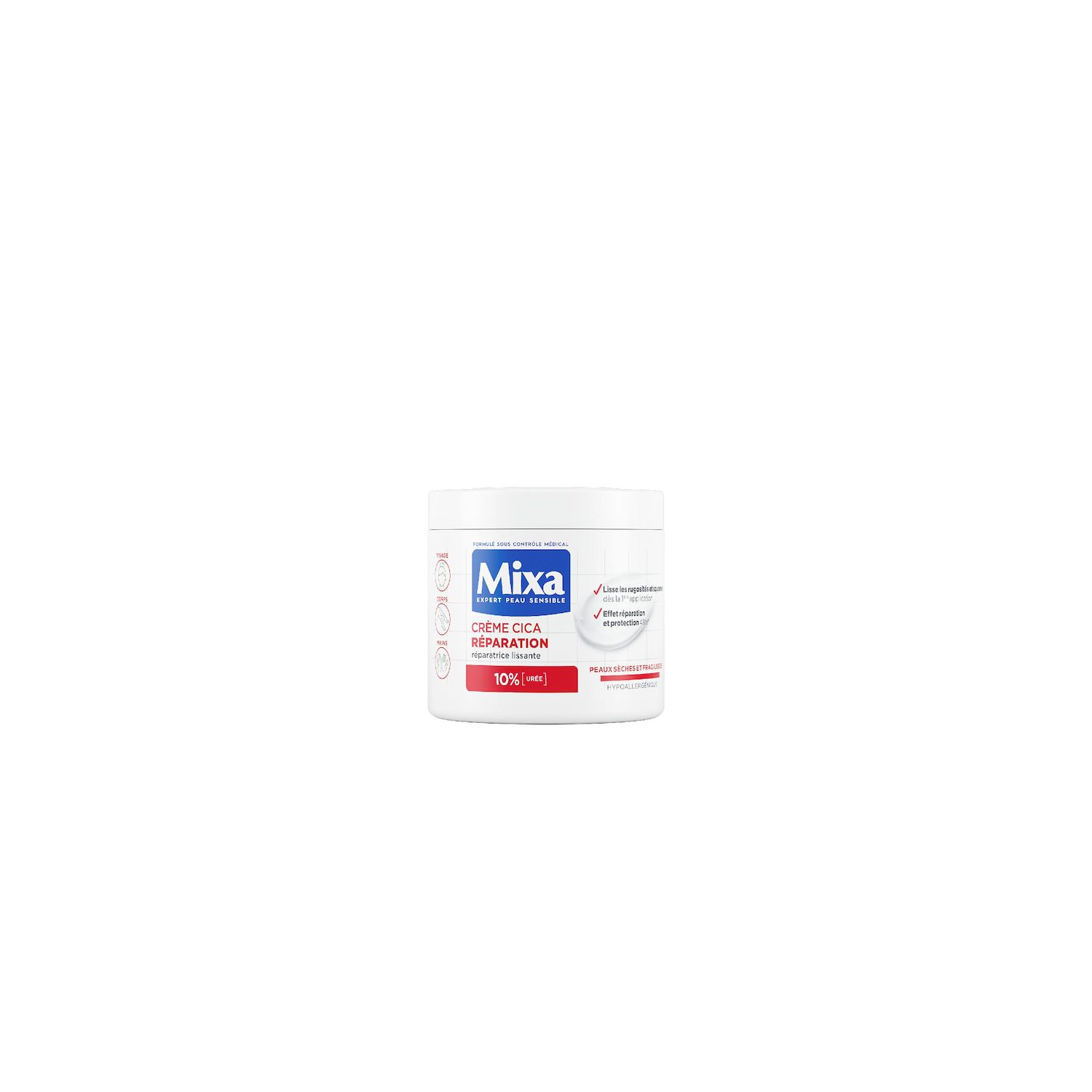 Les peaux sèches et fragilisées exigent des soins hydratants et lissants hautement concentrés qui respectent leur sensibilité : notre crème hydratante et réparatrice, à la texture légère, est hypoallergénique. Stimule le renouvellement cellulaire. Les zones sèches semblent moins rugueuses pour 85% des hommes et des femmes en 1 semaine*. Formulée avec de puissants actifs dermo-cosmétiques et adaptée aux peaux sensibles. Urée : connue pour ses propriétés exfoliantes, lissantes et anti-rugosités. Niacinamide : connu pour ses propriétés hydratantes et apaisantes. Testé sous contrôle médical. Résultats cliniquement prouvés. Testé sur 7000 peaux sensibles.** *Test consommateur réalisé sur 55 sujets. **Tests réalisés sur la liste des produits Mixa à retrouver sur mixa.fr. Les zones sèches semblent moins rugueuses pour 85% des hommes et des femmes en 1 semaine.