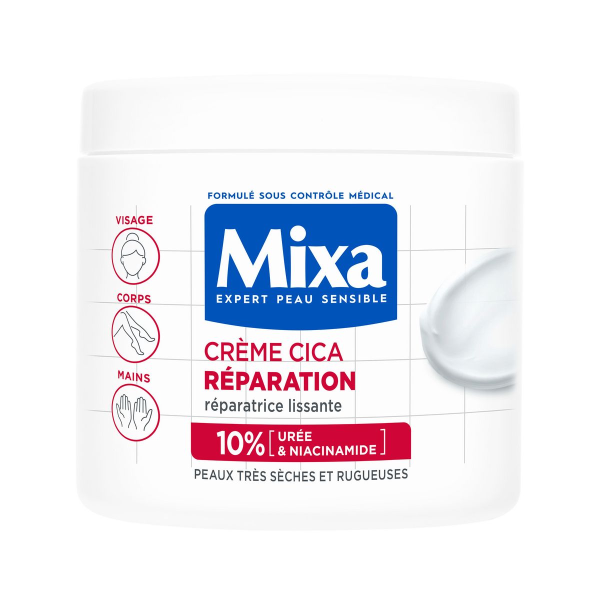 Les peaux sèches et fragilisées exigent des soins hydratants et lissants hautement concentrés qui respectent leur sensibilité : notre crème hydratante et réparatrice, à la texture légère, est hypoallergénique. Stimule le renouvellement cellulaire. Les zones sèches semblent moins rugueuses pour 85% des hommes et des femmes en 1 semaine*. Formulée avec de puissants actifs dermo-cosmétiques et adaptée aux peaux sensibles. Urée : connue pour ses propriétés exfoliantes, lissantes et anti-rugosités. Niacinamide : connu pour ses propriétés hydratantes et apaisantes. Testé sous contrôle médical. Résultats cliniquement prouvés. Testé sur 7000 peaux sensibles.** *Test consommateur réalisé sur 55 sujets. **Tests réalisés sur la liste des produits Mixa à retrouver sur mixa.fr. Les zones sèches semblent moins rugueuses pour 85% des hommes et des femmes en 1 semaine.