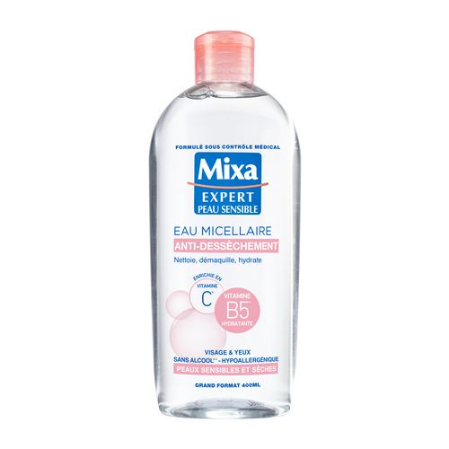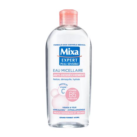 L'Eau Micellaire vitaminée Antidessèchement Mixa nettoie les peaux sensibles et sèches dans le plus grand respect. Sa formule capte et élimine en un seul geste le maquillage, les impuretés et les particules de pollution du visage et des yeux. Une action nettoyante et démaquillante, douce et non asséchante pour les peaux sensibles et sèches. La peau est réhydratée intensément, le teint semble plus frais.