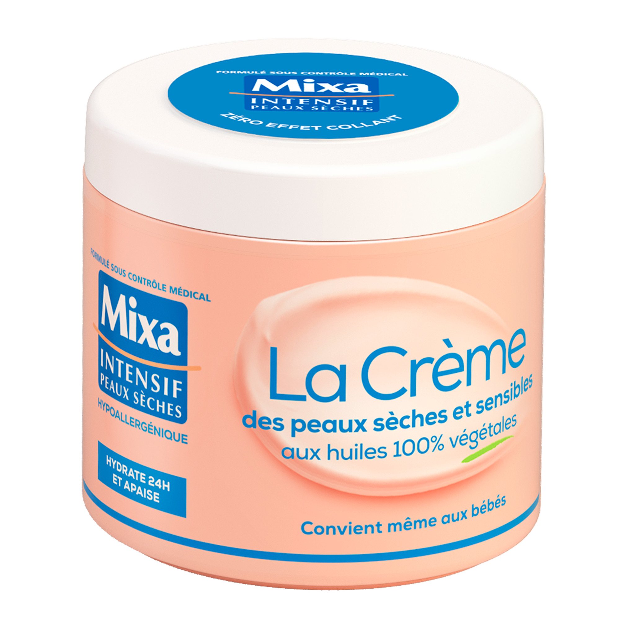 Découvrez la première crème Mixa spécialement conçue pour les peaux sèches et sensibles. Sa formule unique associe des huiles 100% végétales (karité, amande douce et soja) et est enrichie en glycérine pour une hydratation intense et un apaisement immédiat. Elle offre une hydratation longue durée de 24 heures tout en laissant la peau douce et nourrie, sans aucun effet collant. Hypoallergénique et formulée sous contrôle médical, cette crème convient parfaitement à toute la famille, même aux bébés. Et parce que Mixa s'engage à respecter les peaux les plus délicates, elle a été testée avec succès sur plus de 7000 peaux sensibles. Une crème qui adoucit les jambes, nourrit les mains, et apaise même la peau fragile du visage. La peau est plus douce pour 98% des femmes.* *Test consommateur, 50 sujets, 28 jours.