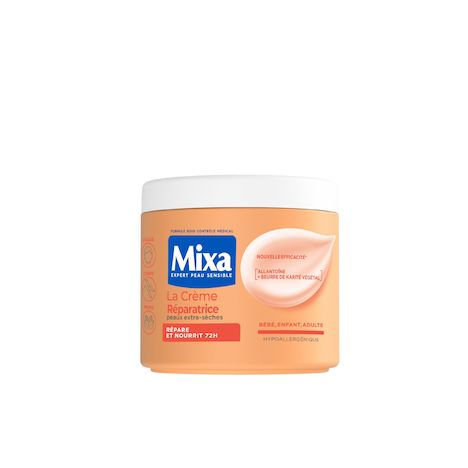 Découvrez la première crème réparatrice Mixa pour les peaux extra-sèches. C’est simple. Elle est composée d’huiles 100% végétales (amande douce et abricot) et sa formule est enrichie en glycérine. C’est efficace. Elle répare les marques de sécheresse et nourrit intensément pendant 72h le corps, le visage et les mains de toute la famille, sans aucun effet collant. C’est sûr. Hypoallergénique et formulée sous contrôle médical, elle est si respectueuse qu’elle convient même aux bébés. Et en plus, Mixa est testée sur plus de 7000 peaux sensibles. Une crème qui adoucit les jambes, nourrit les mains, et apaise même la peau fragile du visage. La peau est plus confortable pour 100% des femmes.* *Test consommateur, 53 sujets, 28 jours