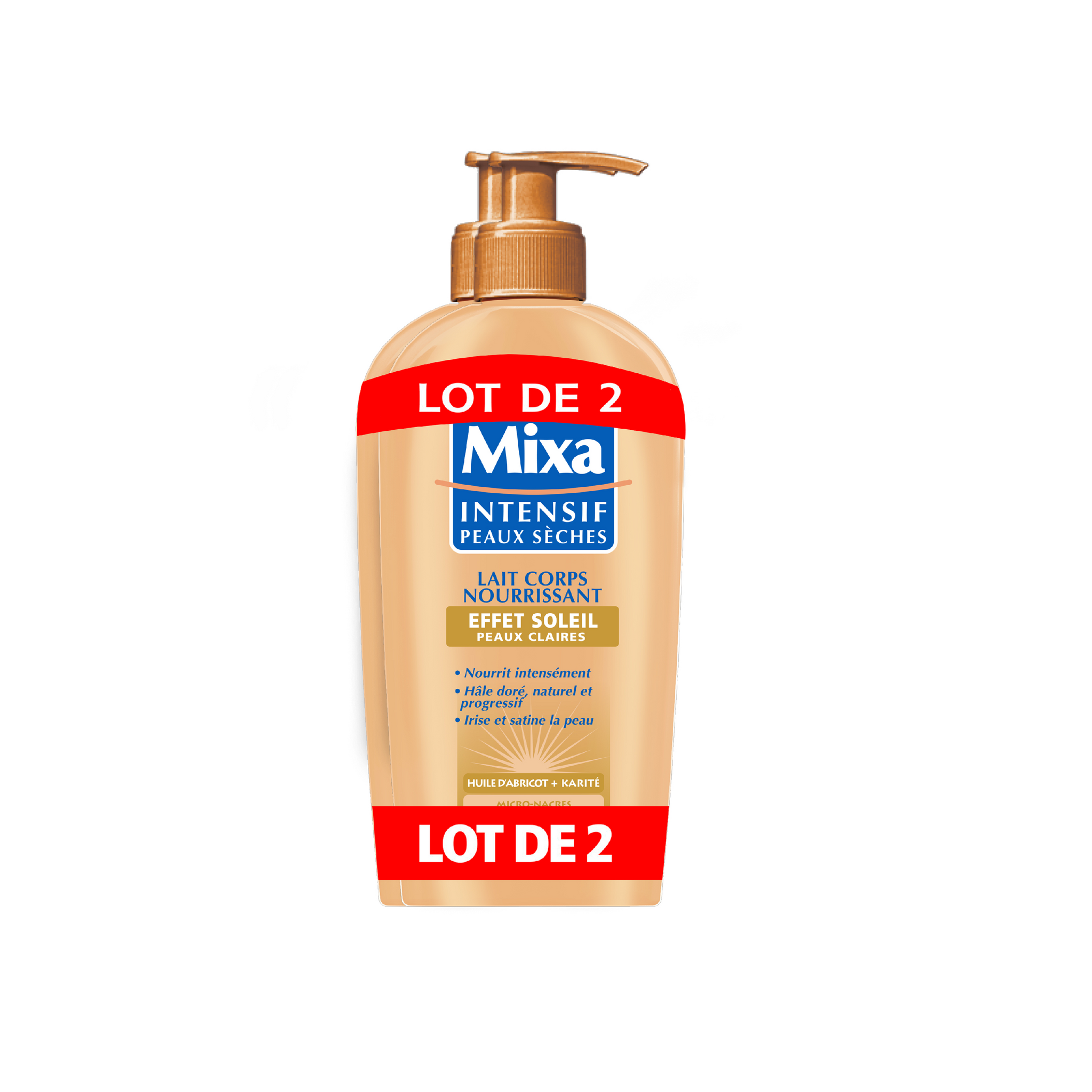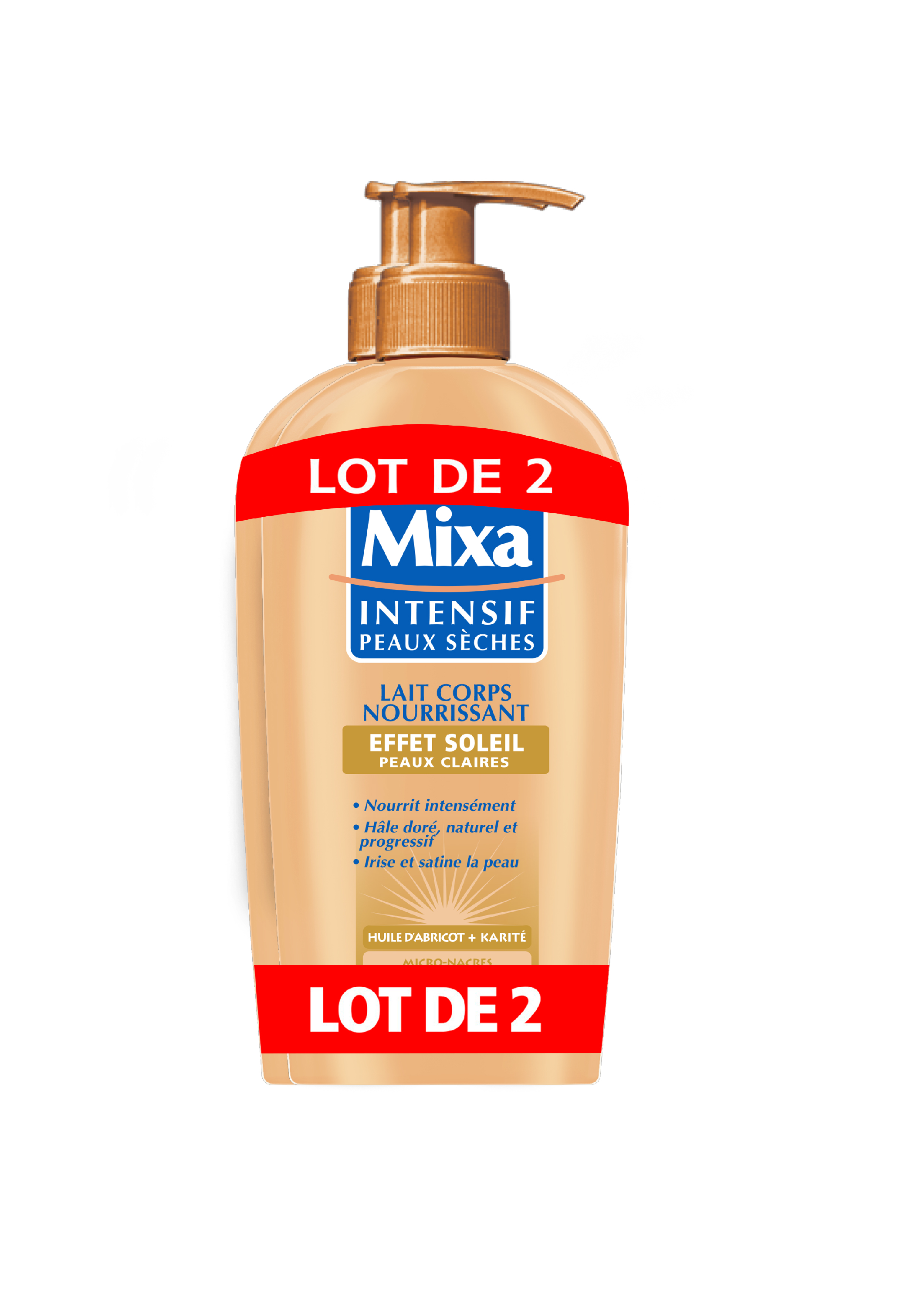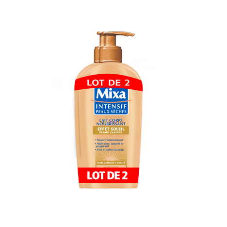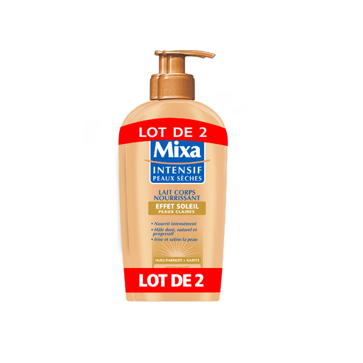 Mixa Intensif Peaux Sèches 500 ml Le Lait Corps Nourrissant Effet Soleil - Peaux Claires - de Mixa pour sublimer les peaux sèches dès la 1ère application et leur apporter un hâle léger et naturel. Les peaux sèches sont efficacement nourries et sublimées. Progressivement, la peau rayonne d'un hâle léger et naturel.