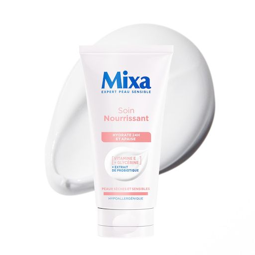 Soumises aux agressions extérieures, les peaux sensibles se fragilisent et se déshydratent. De plus, lorsqu’elles sont sèches à très sèches, des échauffements et des tiraillements se manifestent. DÉCOUVREZ LE SOIN MIXA NOURRISSANT Instantanément : la peau est intensément réhydratée pendant 24H, plus belle et lumineuse. Elle retrouve tout son confort. Durablement : la peau est plus souple, plus douce et plus rebondie. La barrière cutanée est renforcée, la peau est protégée contre le dessèchement cutané. LES ACTIFS HYDRATANTS VITAMINE E : Connue pour ses vertus hydratantes & anti-tiraillements pour une action durable contre le dessèchement cutané. Extraits de probiotique : Connus pour leur action protectrice, ils contribuent au maintien de l’hydratation de la peau. LA SENSORIALITE MIXA Sa texture fluide, non collante et non grasse pénètre facilement dans la peau. Excellente base de maquillage. TOLÉRANCE OPTIMALE Une formule hypoallergénique, testée sous contrôle médical sur 100% de p