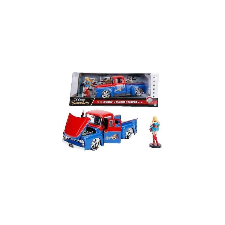 Le modèle réduit JADA DC Comics Bombshells Supergirl de la marque Simba est une pièce de collection réalisée en métal et plastique à l'échelle 1:24. Ce produit sous licence officielle représente la célèbre Supergirl accompagnée d'un Ford F-100 Pickup de 1956, offrant un design attrayant et des détai