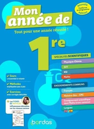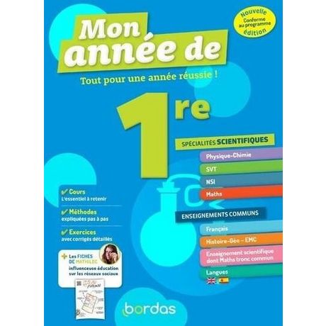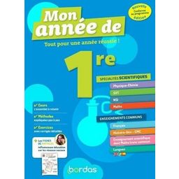 Toutes les matières de l'année de 1re réunies dans un seul ouvrage. Ce tout-en-un accompagne le lycéen durant son année de 1re et lui permet d'approfondir les notions clés du programme scolaire pour réussir le contrôle continu et les épreuves anticipées du bac de français Conçu et rédigé par des enseignants , Mon année de 1re Spécialités scientifiques est conforme au programme de l'Education Nationale. Cet ouvrage de soutien scolaire propose du cours, de la méthode et des exercices variés pour les enseignements communs (Français, Histoire-Géo-EMC, Enseignement scientifique dont Maths tronc commun, Anglais, Espagnol et les spécialités, Physique-Chimie, SVT, NSI, Maths. Toutes les disciplines sont facilement repérables grâce aux onglets de couleur. Pour chaque notion abordée, l'objectif de travail clairement annoncé permet à l'élève de faire ses révisions selon une approche simple en trois temps : Le cours pour retenir l'essentiel La méthode à maîtriser pour réussir les épreuves de français et le contrôle continu Les exercices pour un entraînement varié, progressif et minuté En +, les fiches et vidéos de Mathilde, influenceuse Education sur les réseaux sociaux , avec des infos sur les épreuves du bac, des conseils pour réussir le bac de français (oral et écrit) et le contrôle continu. Les + de l'ouvrage Mon Année de 1re : Des exercices résolus et corrigés , des QCM, des schémas de synthèse et des cartes mentales Des encadrés (infos, révision, biographie, , méthode), des mots-clés, le surlignage des termes importants Des vidéos pour se préparer au bac de français (écrit, oral) Des formulaires de maths et de physique-chimie Une frise d'histoire littéraire