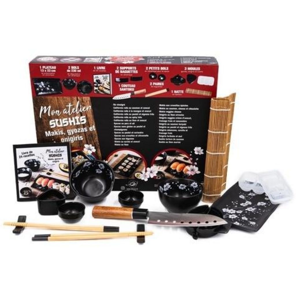 Un tout nouveau coffret mon atelier sushis, makis, gyozas et onigiris de chez I2C ! Un renouveau total pour ce coffret star, qui reste toujours le plus complet du marché dans une version élégante. . A l'ombre des sakuras... . Devenez un maitre de la cuisine japonaise en réalisant de délicieux sushis, makis, gyozas et onigiris maison ! Avec ce coffret, le plus complet du marché, les saveurs nippones n'auront plus aucuns secrets pour vous ! Composé d'un couteau SANTOKU de 28 cm, d'une natte à makis en bambou, de deux élégants porte-baguettes, de deux paires de baguettes, d'un moule à gyozas, un moule à onigiris, d'un moule à sushis, de deux pots à sauce en céramique et d'un livre 24 recettes de sushis, makis, California, gyozas, sashimis, onigiris et autres... à réaliser pas à pas : voyage en Asie assuré !