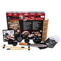 MON ATELIER SUSHIS, MAKIS, GYOZAS ET ONIGIRIS. COFFRET AVEC 1 PLATEAU, 2 BOLS, 1 LIVRE DE RECETTES, 1 COUTEAU SANTOKU, 2 PAIRES DE BAGUETTE, 1 NATTE EN BAMBOU, 2 SUPPORTS DE BAGUETTES, 2 PETITS BOLS POUR LA SAUCE ET 3 MOULES, Desgages Aurélie
