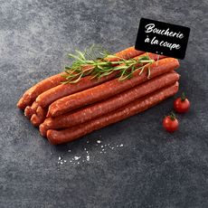 collier de viande bovine 73,1% (Origine France), poitrine d'agneau 12,9% (Origine UE), eau, épices merguez douce 5,3% (sirop de glucose, sel, épices, acidifiant :E262 (3,3%), arômes naturels, plantes aromatiques, colorant :E162, huile de tournesol).