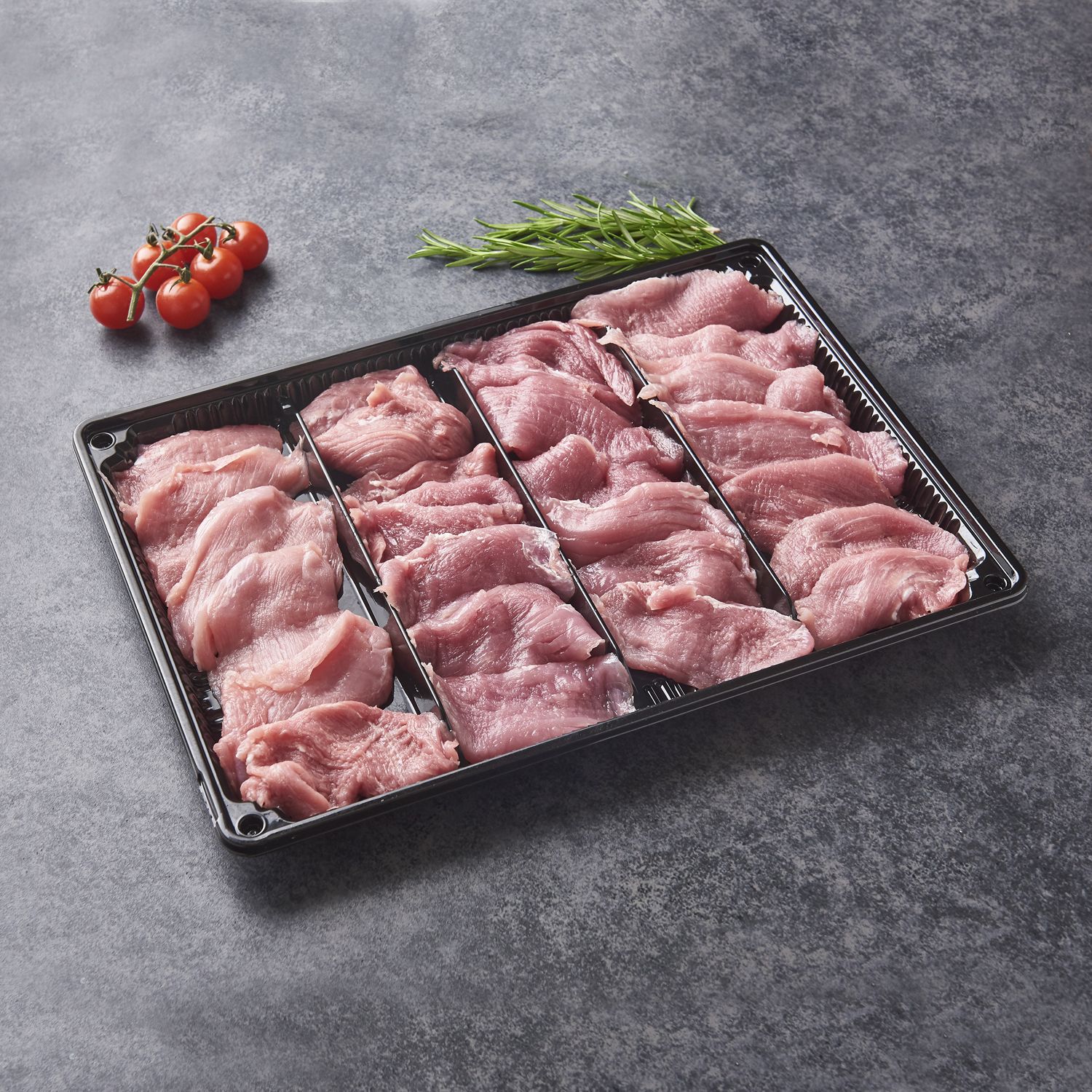 viande de porc marinée au curry 34,4% ( viande de porc 90,9% (Origine France), marinade liquide au curry 9,1% (huile végétale de colza, épices, sel, dextrose, plantes aromatiques, arômes naturels, huile de tournesol)), viande de porc marinée au miel 34,4% ( viande de porc 90,9% (Origine France), marinade liquide miel et abricot séché 9,1% (huiles végétales (colza, karité), abricot séché (15,0%) (SULFITES), arômes, sel, dextrose, oignon frit (oignon, huile de tournesol et/ou colza), farine de riz, miel (1,0%), épices), lomo de porc sauce normande 31,2% ( viande de porc 90,9% (Origine France), marinade normande 9,1% (huile végétale de colza, arômes (contient BLE), sucre, plantes aromatiques, sel, CRÈME en poudre, pomme déshydratée)).