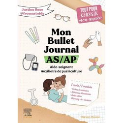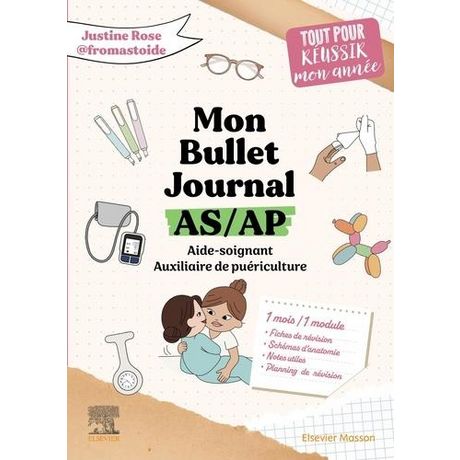 A mi-chemin entre le journal de bord et l'agenda, le Bullet Journal est un outil pratique et ludique qui vous accompagne au quotidien à la fois dans vos fiches personnelles et professionnelles. Le Bullet Journal, parfois aussi appelé Bujo , laisse libre court à l'imagination et permet de s'organiser selon une méthode précise, efficace et ludique. Aujourd'hui appliqué à l'agenda de l'étudiante aide-soignante ou auxiliaire de puériculture, Mon Bullet Journal AS/AP est un peu tout cela, mais davantage encore... puisqu'il est aussi un véritable outil de révision : En plus de servir d'agenda perpétuel, ce Bujo propose de nombreuses sections conçues pour aider les étudiantes à s'organiser efficacement afin de réussir leurs études, stages et examens. En accord avec la dernière réforme, chaque mois, un module est abordé et les rubriques du mois déclinent cette thématique de la façon suivante : Calendrier et objectifs du mois , Programme de révision (Study tracker) , Humeurs , Schémas à compléter , Semainier. Un mode d'emploi est proposé en début d'ouvrage pour bien comprendre le fonctionnement du Bujo. Outil ludique que l'élève-peut annoter et personnaliser 8 chaque page, Mon Bullet Journal AS/AP est destiné aux aides-soignantes et auxiliaires de puériculture, étudiantes ou déjà diplômées.
