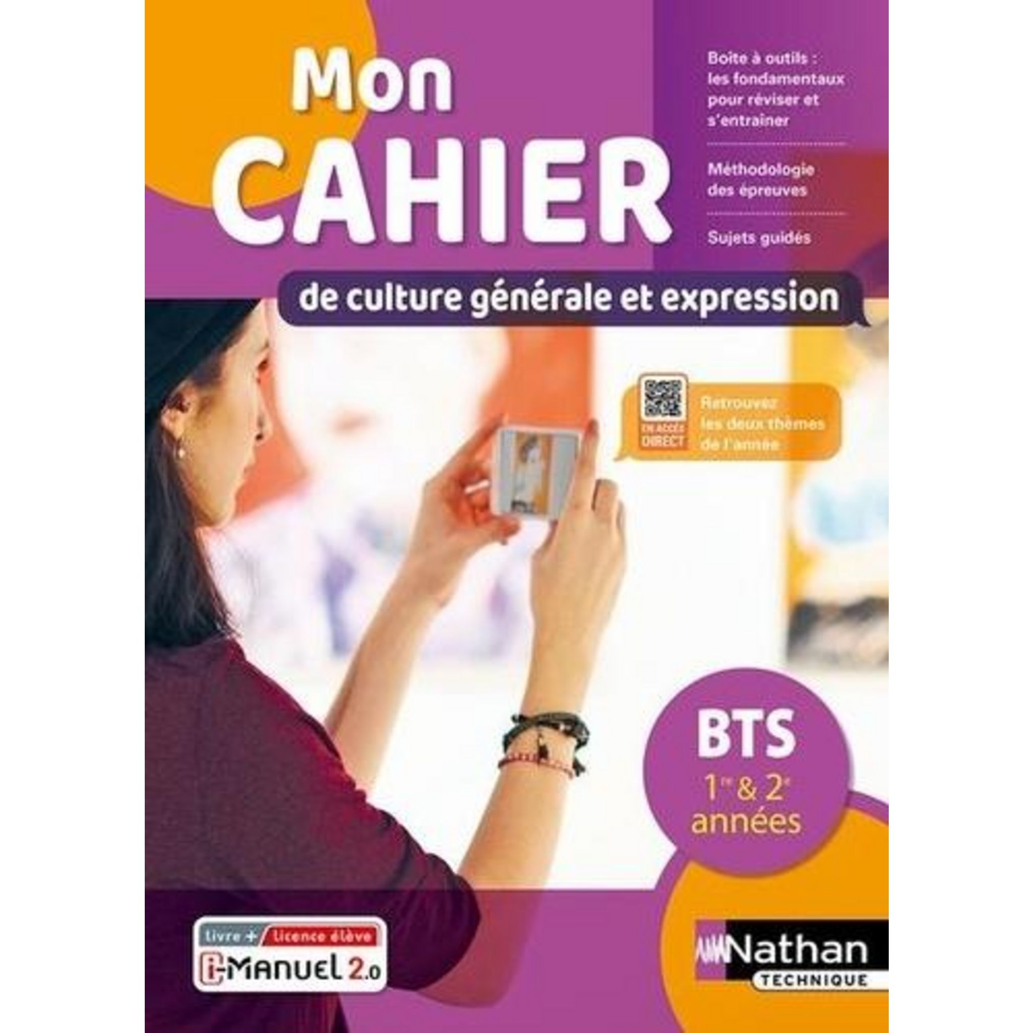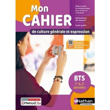 Mon cahier de Culture générale et expression pour le BTS 1re et 2ème années, sous la forme d'un ouvrage consommable, donne aux étudiants les outils pour réviser le programme et offre une méthode d'entraînement pas-à-pas. Cet ouvrage est proposé au choix en livre papier + licence numérique i-Manuel ou en 100% numérique i-Manuel. En version imprimée, cet ouvrage propose en complément une licence numérique i-Manuel 2. 0, la solution pour mettre les élèves en activité sur ordinateur ou sur tablette. Les infos pratiques sur le i-Manuel 2. 0 à découvrir ci-dessous Structure de l'ouvrage : - Une page de début pour aborder les deux thèmes de l'année avec une bibliothèque commentée pour développer la curiosité des étudiants et des exercices/sujets pour enrichir sa culture générale (accessibles via des QR Codes mis à jour chaque année). - Un programme d'entraînement, organisé en trois parties, sous forme de fiches détachables, claires et structurées : 1. La boîte à outils pour travailler les points fondamentaux 2. La méthodologie des épreuves pour progresser 3. S'entraîner sur les sujets guidés pour réussir les épreuves du BTS.