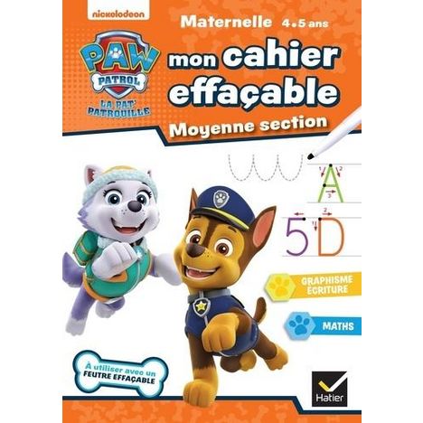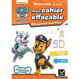 Un cahier effaçable de Moyenne Section de maternelle pour s'entrainer à écrire les lettres majuscules bâtons et les chiffres, et à tracer des formes. La Pat Patrouille aide à progresser grâce à des activités qu'on peut refaire à l'envi. On écrit, on efface et on recommence ! A utiliser avec un feutre effaçable.