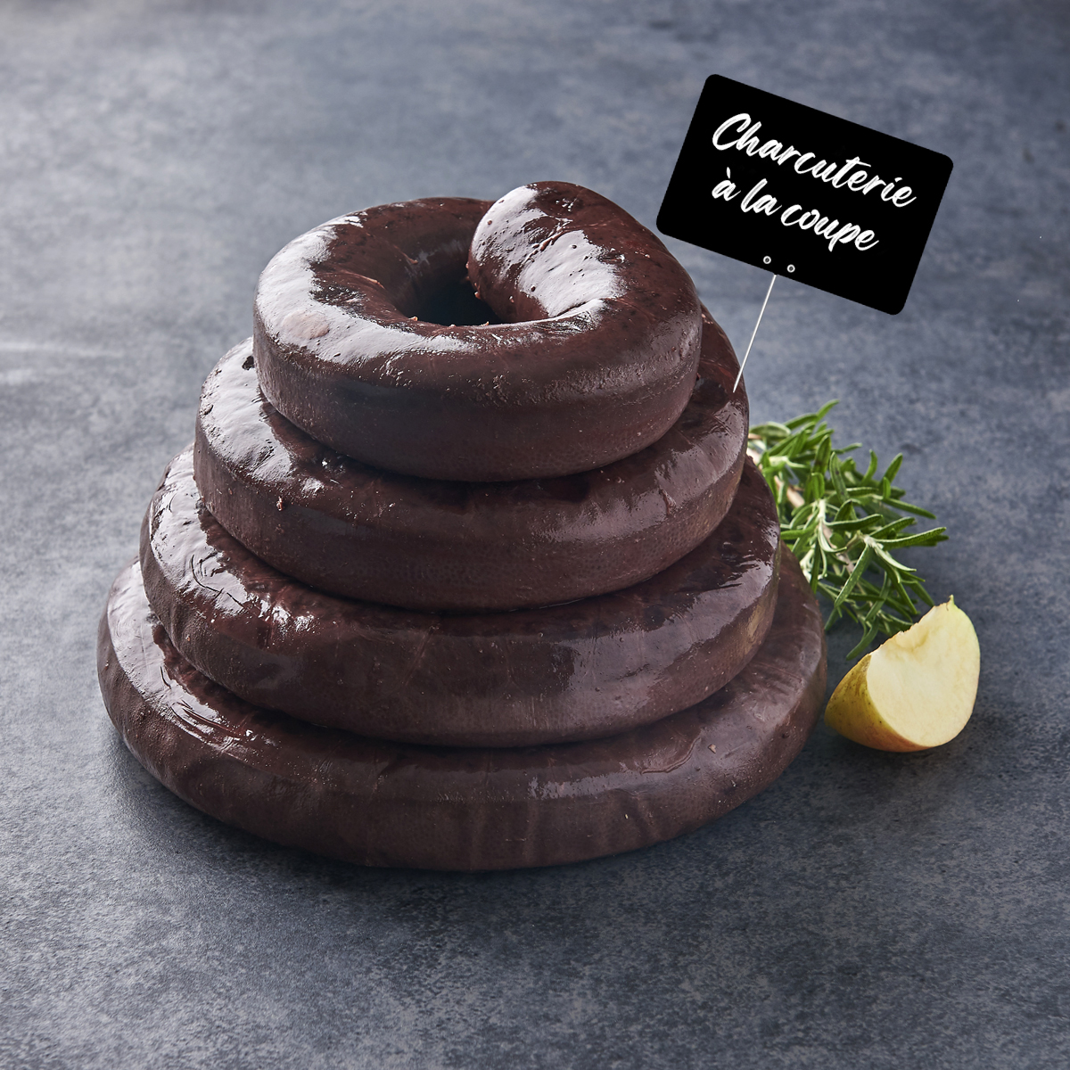 sang de porc (origine : France), oignons, gras de porc (origine : France), puree de pommes 12,9%, couenne, sucre, sel, epices, plantes aromatiques, boyau naturel de porc.