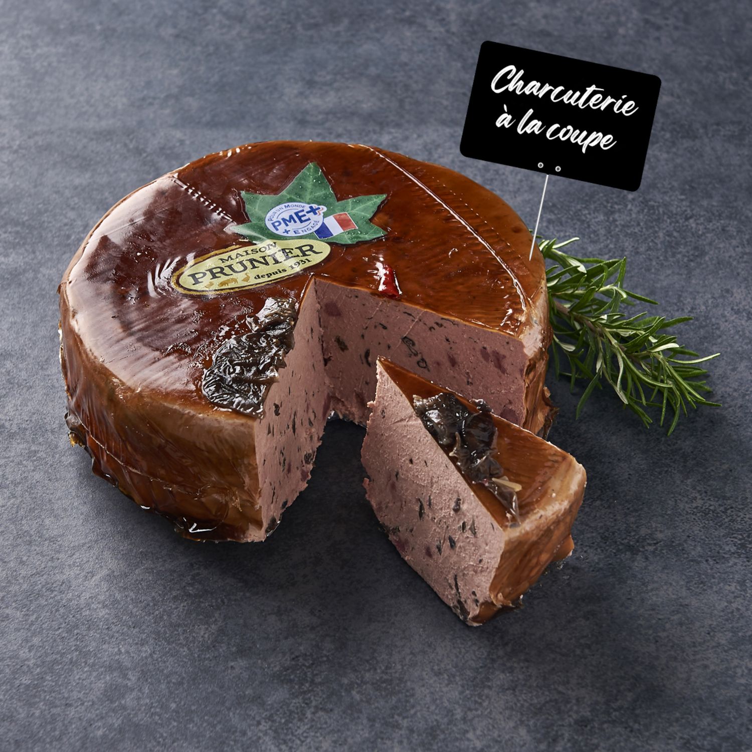gras de porc (origine : France), eau, foie de porc (origine : France), champignons 9% (bolets jaunes, champignons noirs, pleurotes, girolles), foie de dinde (origine : France), sel, protéine de SOJA, sirop de glucose, arômes (SOJA), porto, dextrose, plantes aromatiques, épices, protéine de LAIT, protéine de BLE, plasma de porc, antioxydant : E316 E301, conservateur : E250, décor (champignons (bolets jaunes, champignons noirs, pleurotes, girolles), sel, piment, eau, gélatine de porc, gélifiant : E407, colorant : E150a).