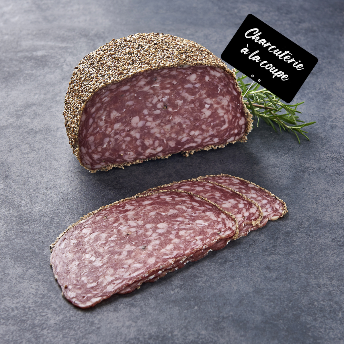 viande de porc (origine : France), sel, LACTOSE, dextrose, epices, sucre, plantes aromatiques, conservateur : E252 E316, ferments, enrobage (poivre (2,3% env), gelatine de porc, conservateur : E202), enveloppe : collagene.