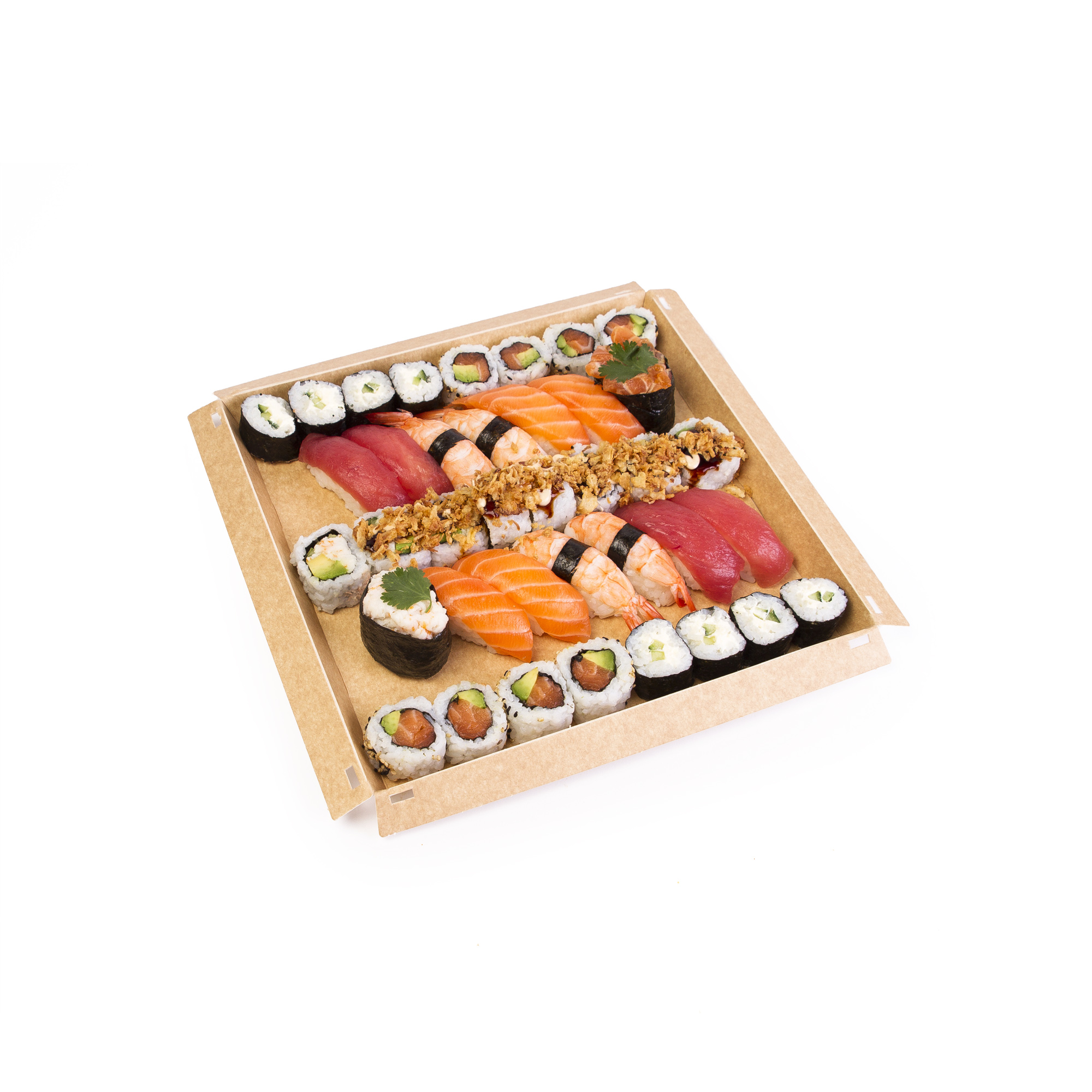 Ingrédients : Riz préparé (eau, riz, vinaigre de céréales (vinaigre d'alcool (alcool, BLÉ (GLUTEN), lies de saké, riz, maïs), sel), sucre, sel, mirin (régulateur d'acidité E330, conservateurs E211, E202)), SAUMON (POISSON) 9,5%, surimi-mayonnaise 7,5% (batonnet de surimi 6% (eau, préparation à base de chair de POISSON, amidon de blé (GLUTEN), amidon de tapioca, sucre, amidon de tapioca modifié, sel, huile de palme, protéines de SOJA, extrait de crabe (CRUSTACE), arôme crabe, exhausteur de goût E635, poudre de blanc d'OEUF, colorants (E160c, E452)), mayonnaise 1,5% (OEUF, MOUTARDE, acidifiant E330, conservateur E224, sirop de glucose-fructose, amidon modifié E1422, stabilisant E415, épaississant E412, colorant E160a)), avocat 7%, THON (POISSON) 4,3%, concombre 3,8%, crevettes cuites 3% (crevettes (CRUSTACÉS), sel), oignons frits (contient GLUTEN), fromage fouetté 2,2% (fromage frais (LAIT), sel), sauce unagi (dont SOJA, GLUTEN, colorant E150, exhausteur de goût E621), sauce (dont OEUF, MOUTARDE, sel, acidifiants E330 E260, conservateurs E224 E202, sirop de glucose-fructose, amidon modifié E1422, stabilisant E415, épaississant E412, colorant E160a E150, exhausteur de goût E621, SOJA, GLUTEN, SÉSAME), algue nori, SÉSAME, coriandre.