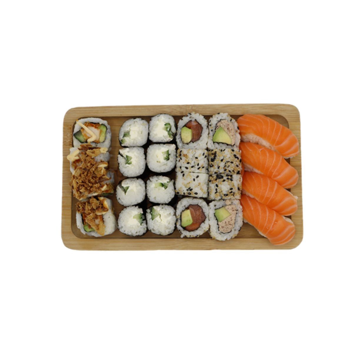Ingrédients : Ingrédients : riz préparé (eau, riz, vinaigre de céréales (vinaigre d'alcool (alcool, BLÉ (GLUTEN), lies de saké, riz, maïs), sel), sucre, sel, mirin (régulateur d'acidité E330, conservateurs E211, E202)), SAUMON (POISSON) 12,2%, avocat 9,1%, concombre 5%, poulet frit 4,5% (filet de poulet (origine Pologne) 64%, eau, farine de BLE (GLUTEN), huile de colza, flocons de piment, sel, amidons (tapioca, pomme de terre), agent levant : carbonate de sodium, amidon modifié de maïs, levure, protéine de pois, stabilisant : citrate de sodium, arômes, légumes déshydratés, épices), fromage frais 3,6% (fromage frais (LAIT), sel), thon au naturel 2,4% (THON (POISSON), eau, sel), mayonnaise 1,8% (huile de colza, eau, jaune d'OEUF, sel, vinaigre d'alcool, sirop de glucose-fructose, sel, amidon modifié E1422, arôme naturel de MOUTARDE, stabilisant E415, épaississant E412, colorant E160a), oignon frit (oignon, huiles végétales (colza, palme), farine de BLÉ (GLUTEN), sel), sauce piment (acidifiants E260, E330, exhausteur de goût E621, stabilisant E415, conservateur E202), mélange d'épices (SÉSAME), huile de SÉSAME), sauce unagi (sauce SOJA (eau, graines de SOJA, BLÉ (GLUTEN), sucre, eau, riz fermenté, amidon modifié, colorant E150a, vinaigre de riz, vinaigre, extrait de levure), algue nori, SÉSAME, ciboulette.
