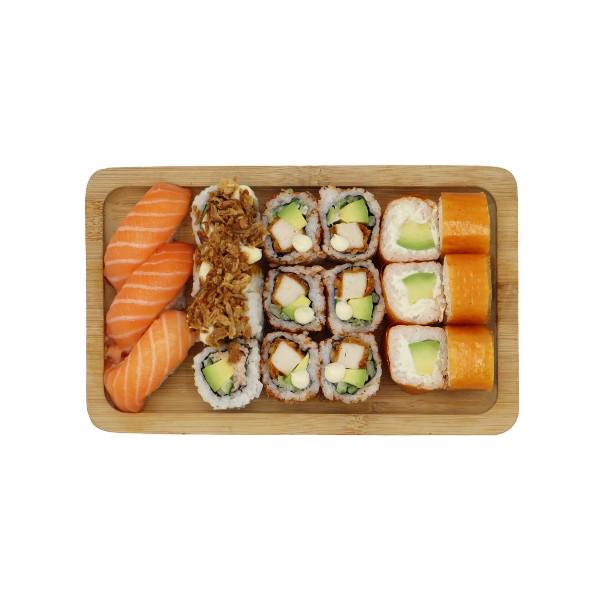 Ingrédients : Ingrédients : riz préparé (eau, riz, vinaigre de céréales (vinaigre d'alcool (alcool, BLÉ (GLUTEN), lies de saké, riz, maïs), sel), sucre, sel, mirin (régulateur d'acidité E330, conservateurs E211, E202)), avocat 12,1%, SAUMON (POISSON) 6,8%, fromage frais 5,6% (fromage frais (LAIT), sel), oignon frit (oignon, huiles végétales (colza, palme), farine de BLÉ (GLUTEN), sel), thon au naturel 3% (THON (POISSON), eau, sel), concombre, salade, sauce unagi (contient SOJA, GLUTEN, colorant E150, exhausteur de goût E621), sauce piment (acidifiants E260, E330, exhausteur de goût E621, stabilisant E415, conservateur E202), mélange d'épices (SÉSAME), huile de SÉSAME), galette de riz (amidon de tapioca, farine de riz, eau, sel), SÉSAME, algue nori.