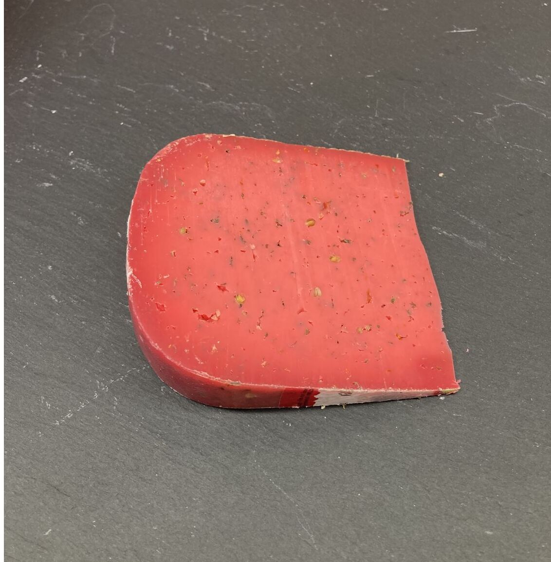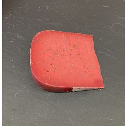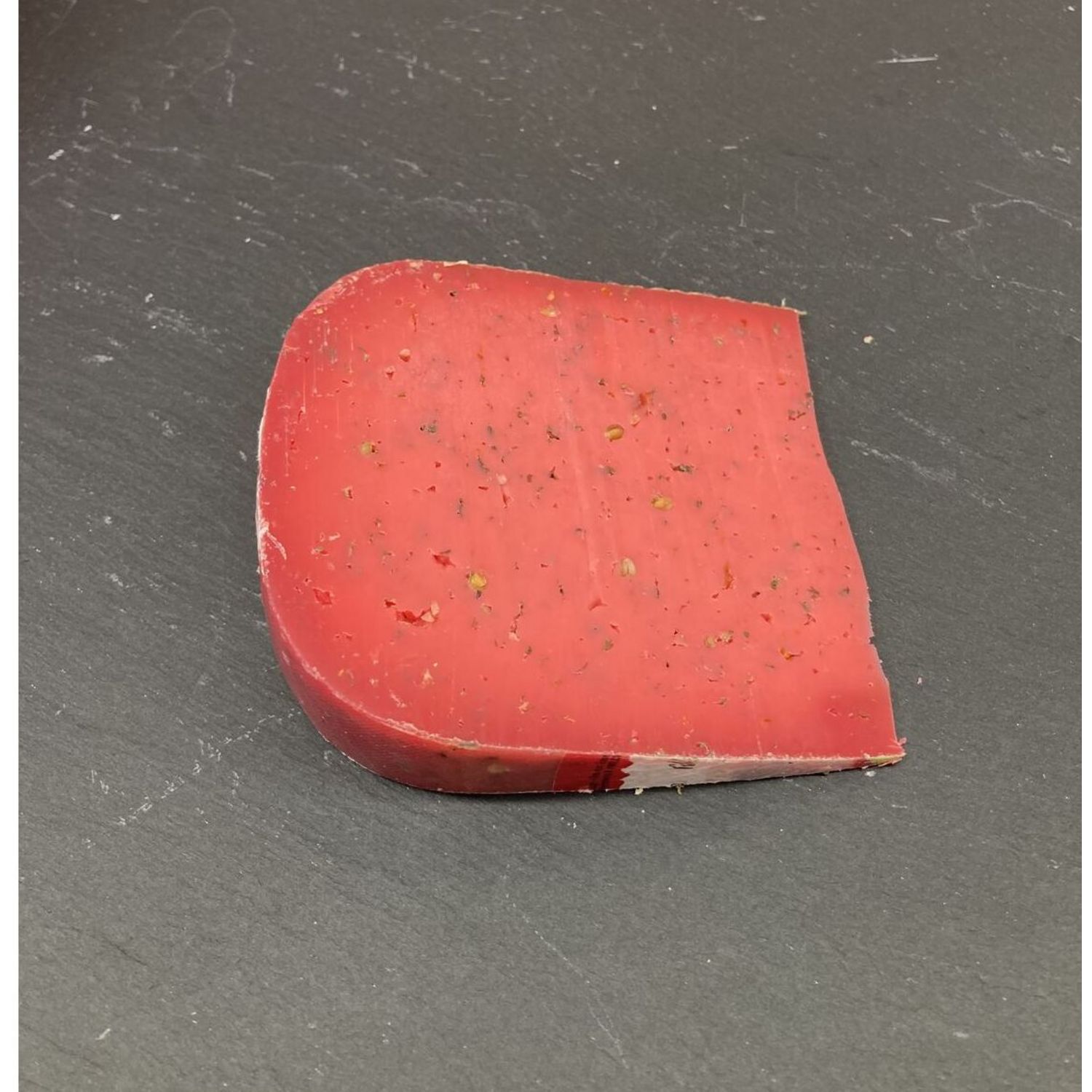 Fromage gouda fermier pesto rouge au lait thermisé de vache, température inférieure à la pasteurisation.