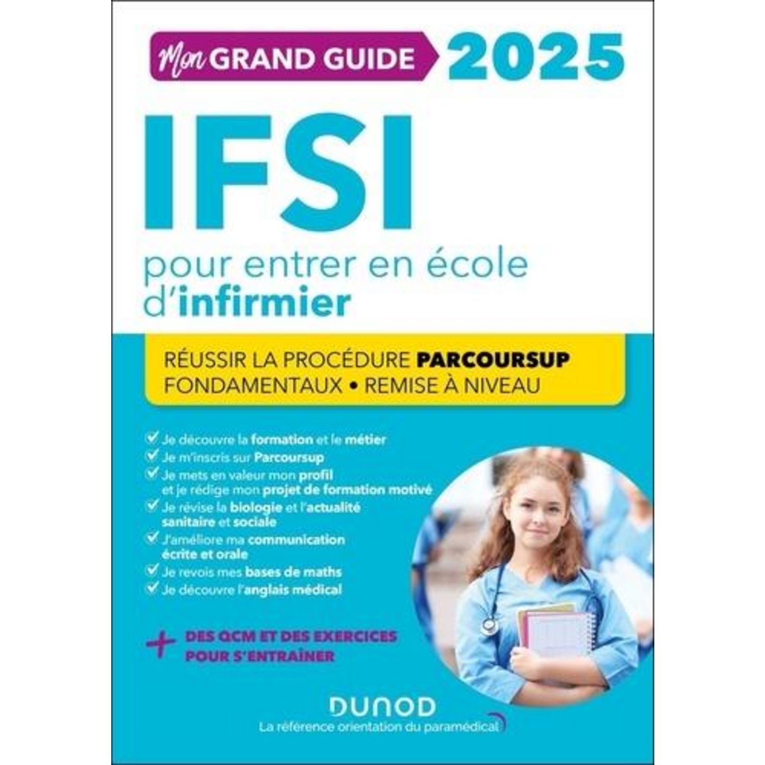 De candidat à infirmier : Je découvre la formation en IFSI Comment se déroule-t-elle ? Quel est le programme ? Quelle part de formation pratique ? Je découvre le métier d'infirmier : Quel est son rôle ? Où et avec qui exerce-t-il ? Quelle est sa rémunération ? Quelles évolutions de carrière. Je révise mes fondamentaux : Mon cours de biologie illustré. Mes fiches d'actualité sanitaire et sociale Plus de 100 QCM corrigés Je réussis la procédure Parcoursup : Je saisis mes voeux dans Parcoursup Comment fonctionne la plateforme ? Quel est le calendrier ? Quels sont les attendus des IFSI ? Je mets en valeur mon profil et je rédige mon projet de formation. Quels sont les points clés de mon parcours personnel ? Comment valoriser ma motivation ? Je me remets à niveau J'améliore ma communication écrite et orale. Je revois mes bases de mathématiques. Je découvre plus de 700 expressions d'anglais médical.