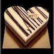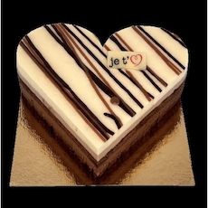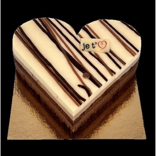 Biscuit génoise cacao garni d'un croustillant au praliné, des mousses au chocolat noir, au chocolat au lait et au chocolat blanc - surgelé.