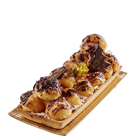 Pâte sablée et pâte à choux garnies de creme legere, glacage chocolat..