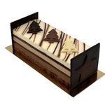 Décors : plaquettes en chocolat noir et chocolat au lait et/ou chocolat blanc (pâte de cacao, sucre, beurre de cacao, LAIT entier en poudre, émulsifiant : E322 (SOJA), arôme naturel de vanille).
