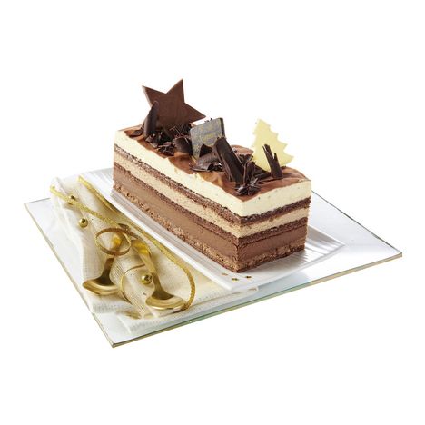 Biscuit cacao garni de mousse chocolat noir, blanc, au lait, produit decongele..