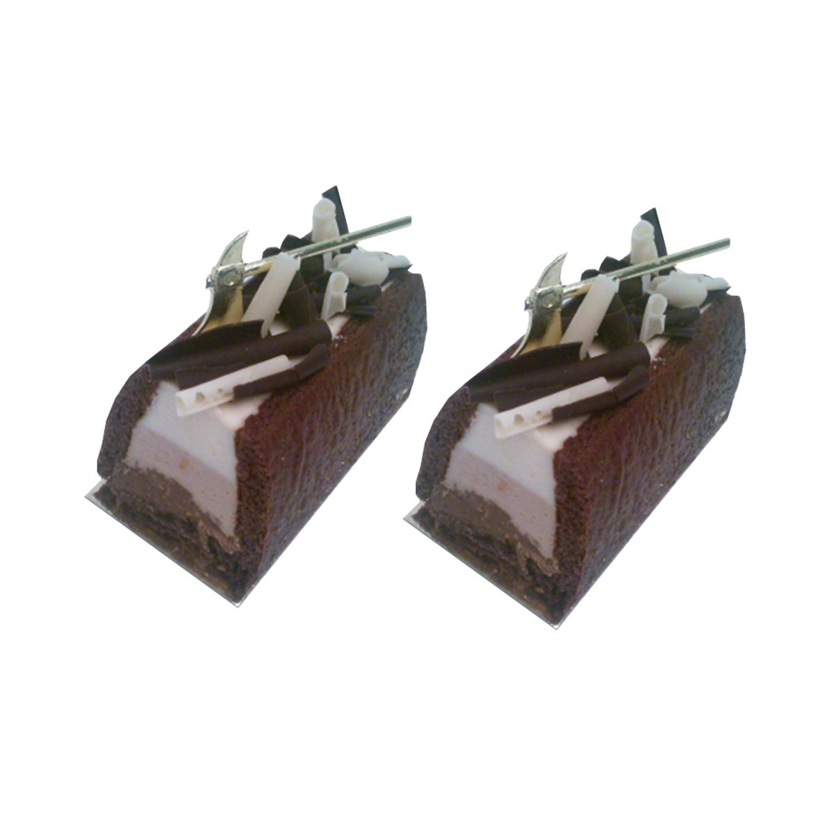 Biscuit cacao mousse chocolat noir, blanc et lait. Produit decongele..