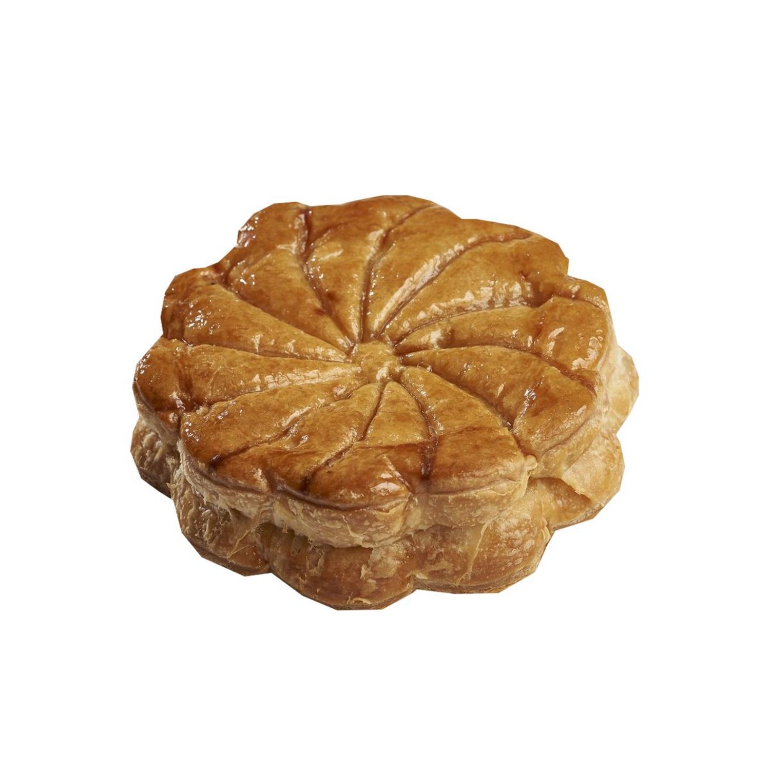 pate feuilletee 65,5% (farine BLE (GLUTEN), BEURRE (LAIT) 33%, eau, sel), frangipane 33% (sucre, BEURRE (LAIT) 22,5%, poudre d'AMANDES blanchies 22,5%, OEUFS, LAIT entier, farine de BLE, amidon de BLE, arome naturel d'AMANDE, arome naturel de vanille), dorure 1,5% (OEUFS), sirop (sucre, eau (eau)).
