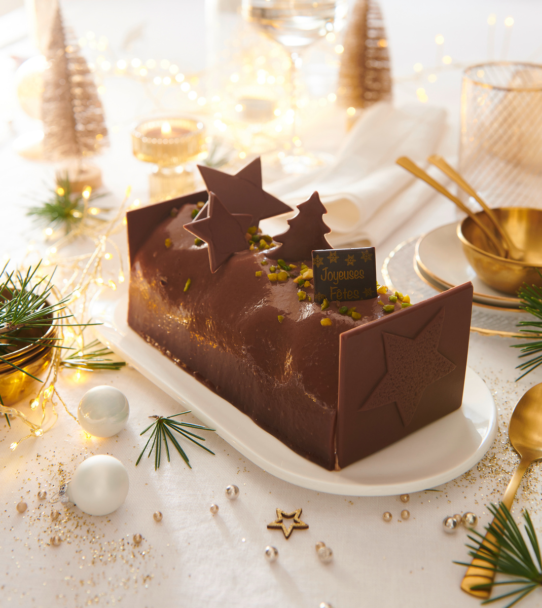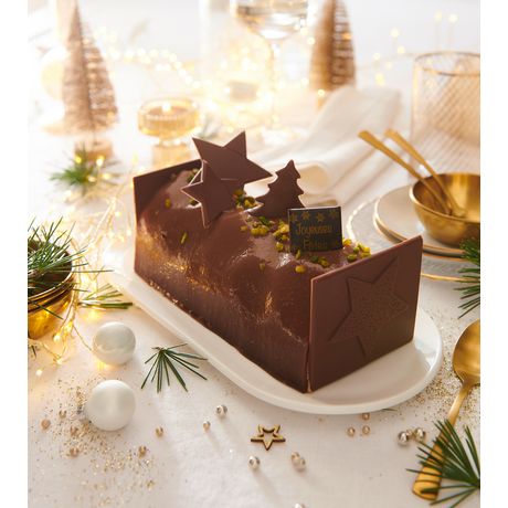 buche riviera 95,1% (CREME UHT (CREME, stabilisant : E407), eau, sucre, OEUF entier, chocolat noir (pâte de cacao, sucre, beurre de cacao, émulsifiant : E322 (SOJA)), sirop de glucose, farine de BLE, pâte de PISTACHE 3,06%, fourrage au praliné 2,75%(praliné 93% (sucre, NOISETTE, AMANDE), huile de tournesol, sucre, émulsifiant : E322 (SOJA)), BEURRE, huile de colza, pâte de NOISETTE 1,84%, brisure de crêpes dentelle ((farine de BLE, sucre, LAIT demi écrémé, BEURRE concentré, sel) (contient du SOJA)), chocolat de couverture au LAIT (sucre, beurre de cacao, poudre de LAIT entier, pâte de cacao, émulsifiant : lécithine de SOJA, arôme naturel de vanille), poudre de LAIT entier, jaune d'OEUF, amidon de maïs, PISTACHE verte hachée 0,45%, arôme naturel de PISTACHE, gélifiant (pectine E440i, saccharose), arôme naturel de café 0,28%(dont sucres), concentré de carthame et de spiruline, émulsifiant : E471), plaquette décor lune chocolat lait (chocolat au LAIT (sucre, beurre de cacao, LAIT entier en poudre, masse de cacao, émulsifiant : lécithine de SOJA, arôme naturel de vanille), amidon de mais, colorant : E100), décor chocolat au lait (chocolat au LAIT (sucre, beurre de cacao, LAIT entier en poudre, masse de cacao, émulsifiant : lécithine de SOJA, arôme naturel de vanille)).