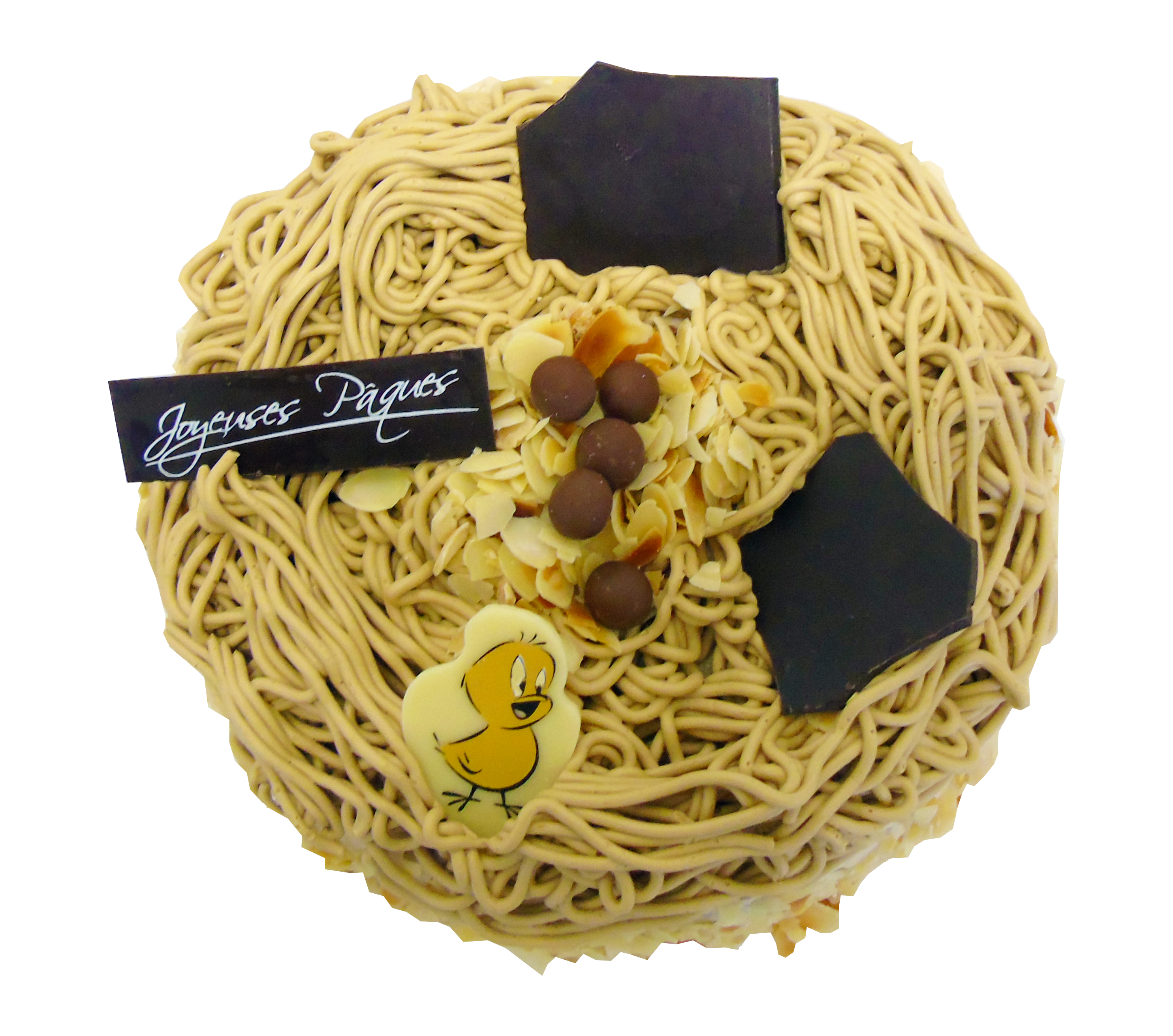 crème au BEURRE café 47,4% (BEURRE, sucre, OEUF, eau, pâte a café (café soluble 0,8%, eau)), Génoise 26,8% (OEUFS, sucre, farine de BLE (GLUTEN), amidon de BLE, eau, stabilisant : sorbitol, emulsifiants : E472b et E477, poudres a lever : E450 et E500, sirop de glucose, poudre de LAIT ecreme, sel, conservateur : E202, epaississant : E410, arome, colorants : riboflavine), sirop(eau, sucre), AMANDES effilées 6,1%, oeuf liqueur (sucre 88%, épaississant : E414, sirop de glucose, amidon de riz, arômes naturels, colorant : extrait de spiruline, E100 E120 E141, agents d’enrobage : E903 E901), décor chocolat (chocolat blanc (sucre, beurre de cacao, LAIT entier en poudre, émusilfiant : lécithine de SOJA, arôme naturel de vanille), poudre de cacao colorants : concentré de radis, de cassis, de pomme, de carthane et de spiruline, E153), décors chocolat noir (masse de cacao, sucre, beurre de cacao, emulsifiant : lecithine de SOJA, arome naturel de vanille amidon de mais, colorant : E100), oeufs en chocolat (chocolat noir (masse de cacao, sucre, beurre de cacao, emulsifiant : lecithine de SOJA, arome naturel de vanille), chocolat blanc et amber, chocolat lait (sucre, beurre de cacao, LAIT entier en poudre, masse de cacao, emulsifiant : lecithine de SOJA, arome naturel de vanille)).