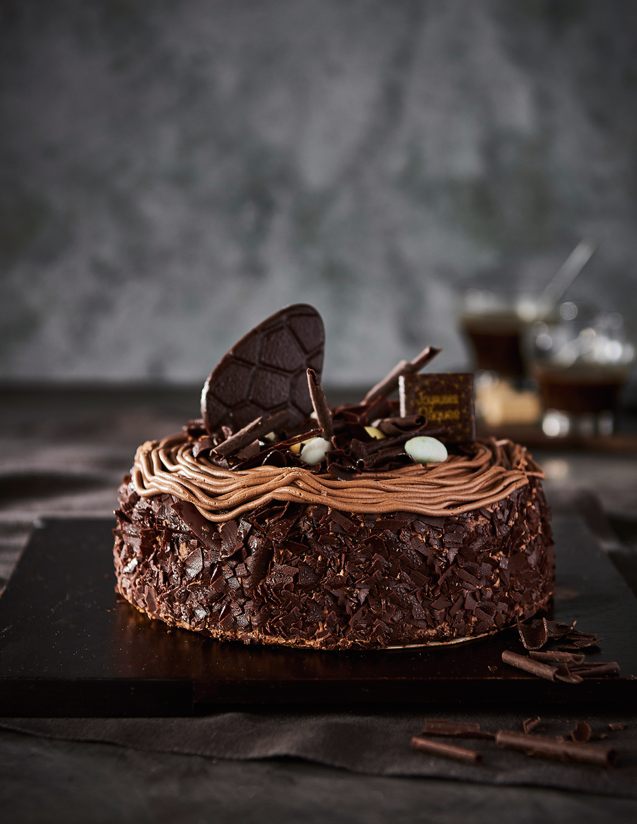 crème au BEURRE cacao 47,2% (BEURRE, sucre, OEUF, eau, pate de cacao), Genoise 27,4% (sucre, OEUF ponte au sol, farine de BLE (GLUTEN), amidon de BLE (GLUTEN), eau, stabilisant E420, poudres à lever E450 et E500, émulsifiants E472b et E477, LAIT écrémé en poudre, sirop de glucose, colorant : riboflavine, épaississant E410, conservateur E202, sel, E202), sirop16,5% (eau, sucre), chocolat noir 5,5% (pate de cacao,sucre,beurre de cacao,huile butyrique(LAIT),emulsifiant :E322(SOJA),arome naturel de vanille), oeuf liqueur (sucre 88%, épaississant : E414, sirop de glucose, amidon de riz, arômes naturels, colorant : extrait de spiruline, E100 E120 E141, agents d’enrobage : E903 E901), décor chocolat 1,1% (chocolat blanc (sucre, beurre de cacao, LAIT entier en poudre, émusilfiant : lécithine de SOJA, arôme naturel de vanille), poudre de cacao colorants : concentré de radis, de cassis, de pomme, de carthane et de spiruline, E153), oeufs en chocolat (chocolat noir (masse de cacao, sucre, beurre de cacao, emulsifiant : lecithine de SOJA, arome naturel de vanille), chocolat blanc et amber, chocolat lait (sucre, beurre de cacao, LAIT entier en poudre, masse de cacao, emulsifiant : lecithine de SOJA, arome naturel de vanille)), décors chocolat noir 0,2% (masse de cacao, sucre, beurre de cacao, emulsifiant : lecithine de SOJA, arome naturel de vanille amidon de mais, colorant : E100).