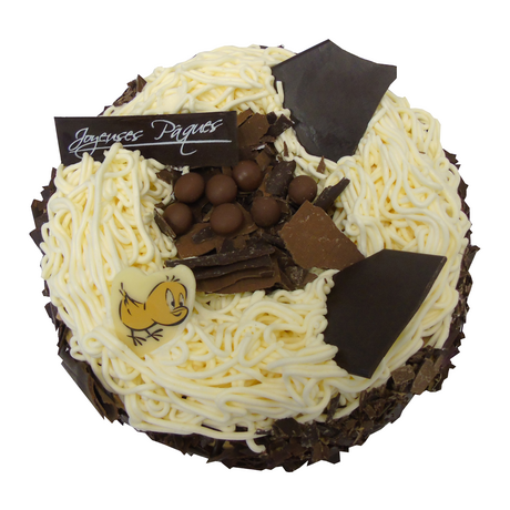 Décors : chocolats (sucre, beurre de cacao, poudre de LAIT entier, pâte de cacao, émulsifiant : E322 (SOJA), arôme naturel de vanille, amidon de maïs, poudre de cacao, colorant : E100).
