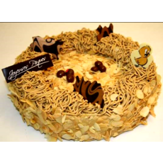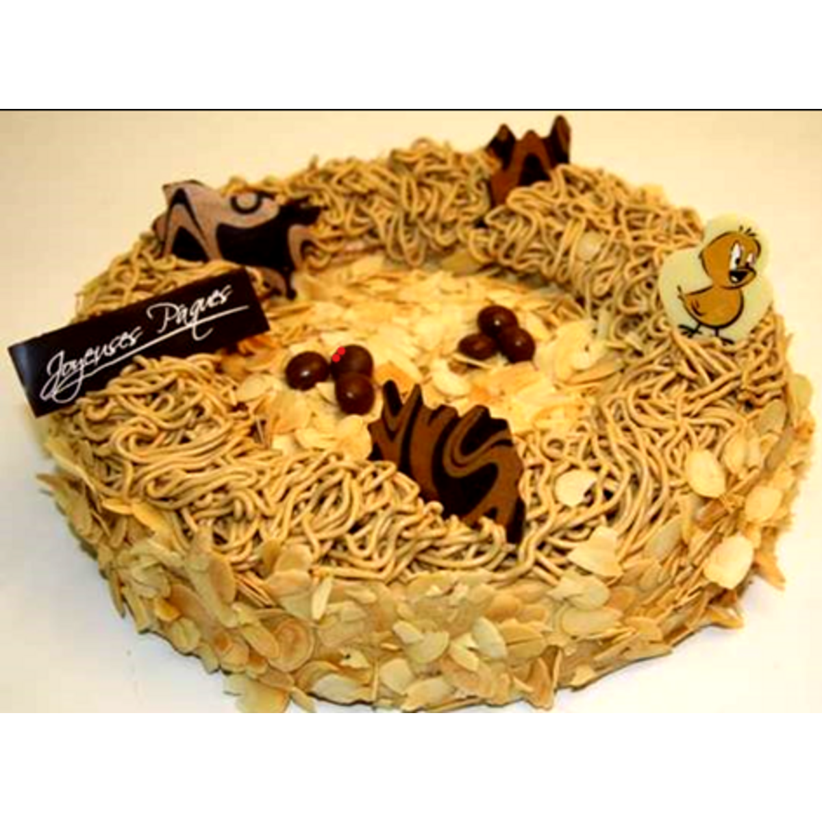 crème au BEURRE café 46,2% (BEURRE, sucre, OEUF, eau, pâte a café (café soluble 0,8%, eau)), Genoise 26,9% (sucre, OEUF ponte au sol, farine de BLE (GLUTEN), amidon de BLE (GLUTEN), eau, stabilisant E420, poudres à lever E450 et E500, émulsifiants E472b et E477, LAIT écrémé en poudre, sirop de glucose, colorant : riboflavine, épaississant E410, conservateur E202, sel, E202), sirop16,1% (eau, sucre), AMANDES effilées 5,9%, oeuf liqueur (sucre 88%, épaississant : E414, sirop de glucose, amidon de riz, arômes naturels, colorant : extrait de spiruline, E100 E120 E141, agents d’enrobage : E903 E901), décor chocolat 1,1% (chocolat blanc (sucre, beurre de cacao, LAIT entier en poudre, émusilfiant : lécithine de SOJA, arôme naturel de vanille), poudre de cacao colorants : concentré de radis, de cassis, de pomme, de carthane et de spiruline, E153), décors chocolat noir 1,1% (masse de cacao, sucre, beurre de cacao, emulsifiant : lecithine de SOJA, arome naturel de vanille amidon de mais, colorant : E100), oeufs en chocolat (chocolat noir (masse de cacao, sucre, beurre de cacao, emulsifiant : lecithine de SOJA, arome naturel de vanille), chocolat blanc et amber, chocolat lait (sucre, beurre de cacao, LAIT entier en poudre, masse de cacao, emulsifiant : lecithine de SOJA, arome naturel de vanille)).