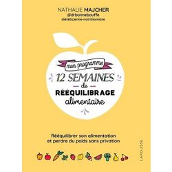 Un programme en 12 semaines pour mieux s'alimenter et atteindre ses objectifs de poids sans frustration ! -12 cours de nutrition éclairants sur l'importance de certains aliments, leurs propriétés, leurs effets sur votre corps et la meilleure façon de les consommer : décrypter vos envies de grignoter, adapter la quantité de féculents dans votre assiette, veiller à votre apport en protéines, suivre votre faim et votre satiété, etc. -Des exercices ludiques pour vous aider à revoir vos habitudes alimentaires. -Quelques recettes gourmandes pour vous donner des idées en cas de panne d'inspiration avec des propositions de menus par saison. -Des espaces à remplir chaque semaine pour noter vos idées de repas, votre liste de courses et les repas quotidiens dans un journal alimentaire. -Un suivi de votre poids et des bilans réguliers pour vous rendre compte de vos avancées tout en inscrivant vos ressentis, vos réussites, vos difficultés et ce que vous pouvez mettre en place pour atteindre vos objectifs. Un carnet de rééquilibrage conçu par une diététicienne pour vous guider étape par étape vers une alimentation équilibrée mais gourmande !