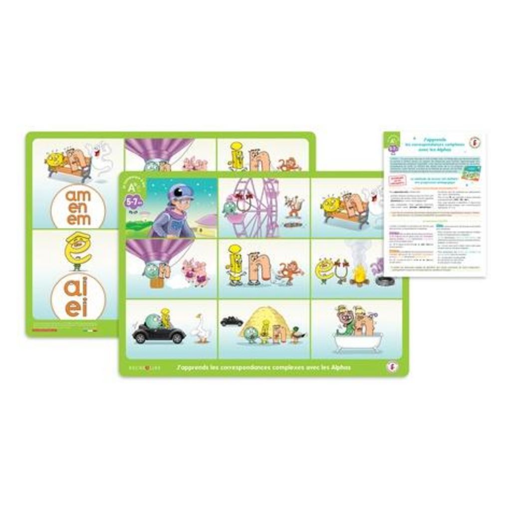 Le sous-main Alphas des correspondances complexes au format A3 (29,7 x 42 cm) présente au recto les différentes correspondances complexes avec les personnages des Alphas pour mieux les retenir (ex avec le son an : monsieur a et le nez sont sur un banc, ils voient un fantôme , ou avec le son ou : monsieur o et mademoiselle u font les fous dans une grande roue en imitant le loup). Au verso, on trouve les différentes manières d'écrire un même son (ex du son an que l'on peut orthographier an/am/en/em). Véritable outil pédagogique, il agit comme un mémo pour l'enfant et lui permet d'avoir en permanence les références dont il a besoin pour mettre en place son apprentissage de manière visuelle afin d'assimiler les correspondances complexes et les différentes manières d'écrire un même son en compagnie des Alphas. Il est accompagné d'un livret pédagogique permettant de comprendre ce que sont les correspondances complexes et comment utiliser ce sous-main. Parfait pour la maison, ce sous-main est un support qui peut accompagner l'enfant dans sa vie quotidienne : sur son bureau, à table en mangeant...