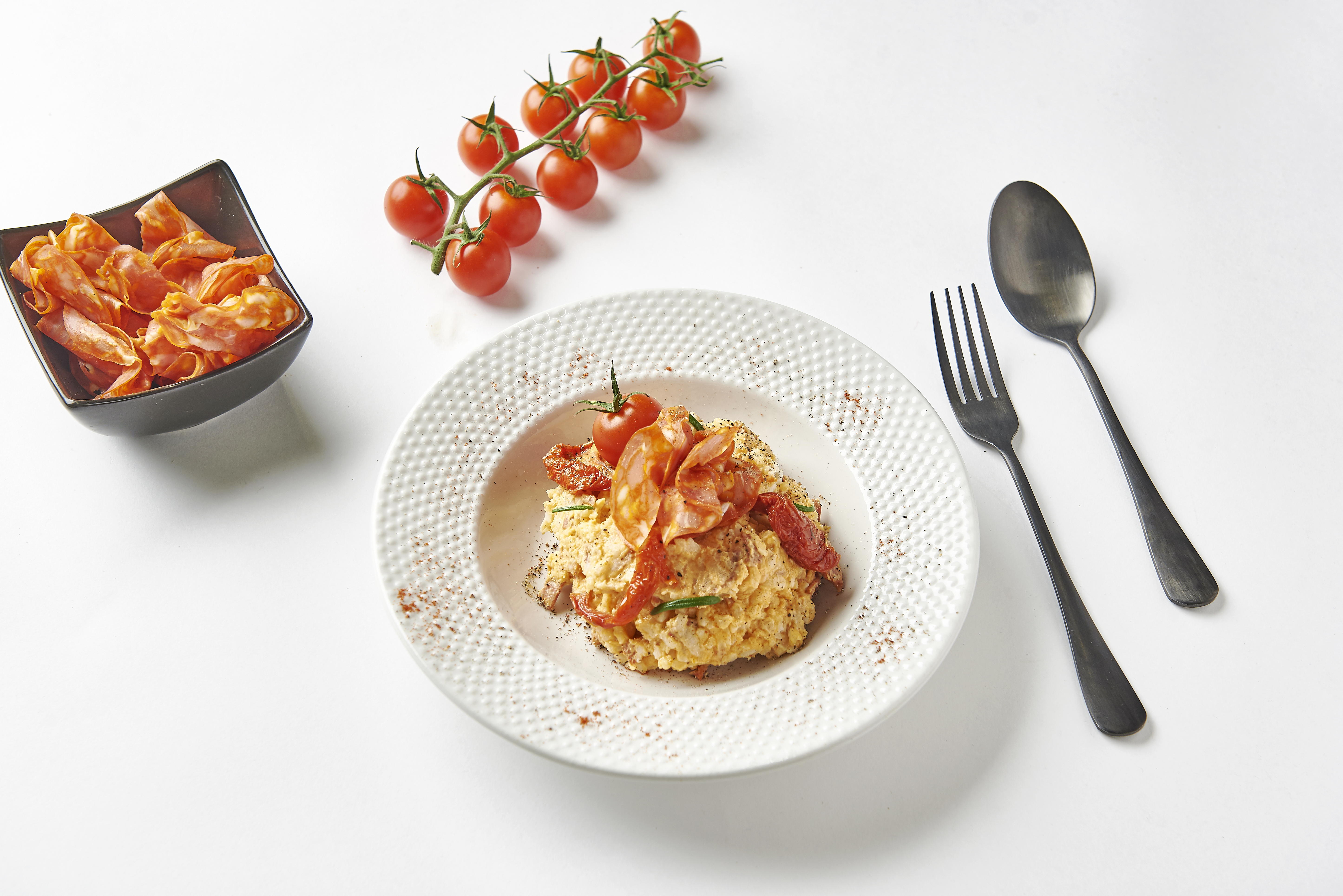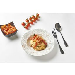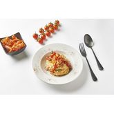 risotto chorizo 94,6% (risotto nature 66,7% ( riz 40,2%, crème liquide (CRÈME légère (LAIT origine france), amidon modifié, stabilisants : E440, E407), PARMIGIANO REGGIANO 12,1% (LAIT de vache entier (origine Italie), sel, présure animale), vin blanc (vin blanc (SULFITES)), oignon 5%, Fonds blanc de volaille (maltodextrine, sel iodé, farine de BLE, volaille 3,7% (graisse de poulet, viande de poule 1%), extrait de levure, oignon, sel, extrait de CELERI rave, extrait de poireau, arômes, extrait de carotte, acidifiant (E330), curcuma, antioxydant (E392), extrait de thym, extrait d'ail), beurre 2% (CRÈMEs LAITières (LAIT), ferments LACTIQUES), huile d'olive vierge extra, poivre blanc, sel), sauce chorizo 33,3% ( allumettes de chorizo 41,4% (viande de porc (origine UE), piments, sel, LACTOSE, plantes aromatiques, dextrose, sucre, conservateurs : E252 et E250, ferments. 135g de viande utilisés pour la préparation 100 g de produit fini), crème liquide 41,4% (CRÈME légère (LAIT origine france), amidon modifié, stabilisants : E440, E407), échalote émincée, huile d'olive vierge extra, tomates confites (Tomates semi-déshydratées (71,30%) (tomates, ail, basilic, origan, thym, sel, sucre, antioxydant :E330), huile de colza), ail, Sel de mer, poivre blanc, sucre)), copeaux de grana padano (LAIT, sel, presure, conservateur: lysozyme d'ŒUF), tomates confites (Tomates semi-déshydratées (71,30%) (tomates, ail, basilic, origan, thym, sel, sucre, antioxydant :E330), huile de colza).