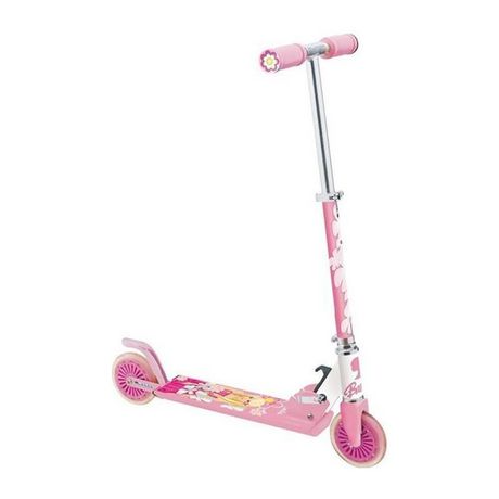 Patinette/trottinette 2 roues en métal et pliable, aux couleurs de Barbie. Elle est idéale pour une conduite en toute sécurité.