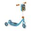 Trottinette 3 roues Buzz l'éclair. Deck plastique antidérapant, structure acier, tubes métal, roues PVC 14cm (avant) / 12cm (arriere), sacoche de guidon amovible, 20kg maximum. Des 2 ans.