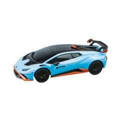 Réplique radiocommandée de la Lamborghini Huracan STO. Les phares s'allument pendant le pilotage. Les portes et le capot s'ouvrent. Échelle : 1/14ème (32cm). Commande toutes directions. Vitesse : 8 km/h. Fréquence : 2,4GHz. Portée : 30 mètres. La carrosserie "Hard body" (plastique rigide) présente un niveau de finition et de détails de grande qualité, aussi bien à l'extérieur qu'à l'intérieur du véhicule, et assure solidité et durabilité.