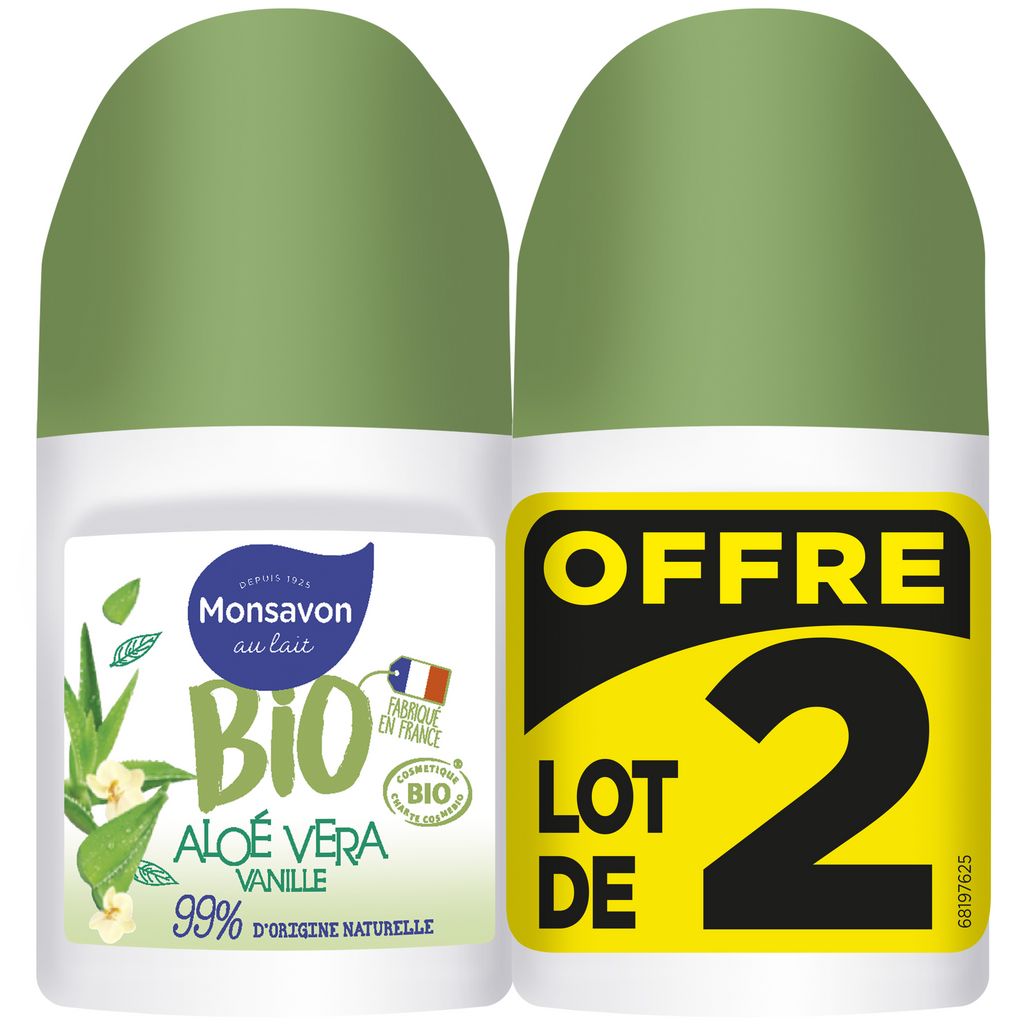 Le déodorant bio Monsavon Aloé Vera pointe de Vanille allie une protection déodorante 24h, sans sel d'aluminium et sans alcool, à un doux parfum, le tout dans un format bille. Dites oui à la fraîcheur ! Ce mariage aloé vera et vanille vous offrira un bol de bonne humeur bien fraîche. Ce n'est pas tout, il est fabriqué en France ! Sa formule bio est certifiée Cosmos Organic par Ecocert et est testée dermatologiquement. Son petit plus, son pack est 100% recyclable. Depuis 1925, Monsavon est une marque emblématique, ancrée dans le cœur des Français. Monsavon s’érige parmi les pionniers des soins beauté : en lançant en 1925 le premier savon au lait (en GMS), la marque transforme un produit d’hygiène basique en un produit de soin pour un véritable moment de bien-être. Le lait est ainsi devenu l’ingrédient indissociable de la marque, synonyme de douceur, d’authenticité et de naturalité… des valeurs chères à Monsavon depuis sa création. Avec ses formules au lait, Monsavon a pour objectif d’offrir plaisir et douceur à toute la famille, et à des prix accessibles ! Monsavon : l'alliance irrésistible du parfum et de la douceur. Le déodorant Monsavon Bio Aloé Vera et Vanille est élu meilleur déodorant bio par 60 millions de consommateurs.